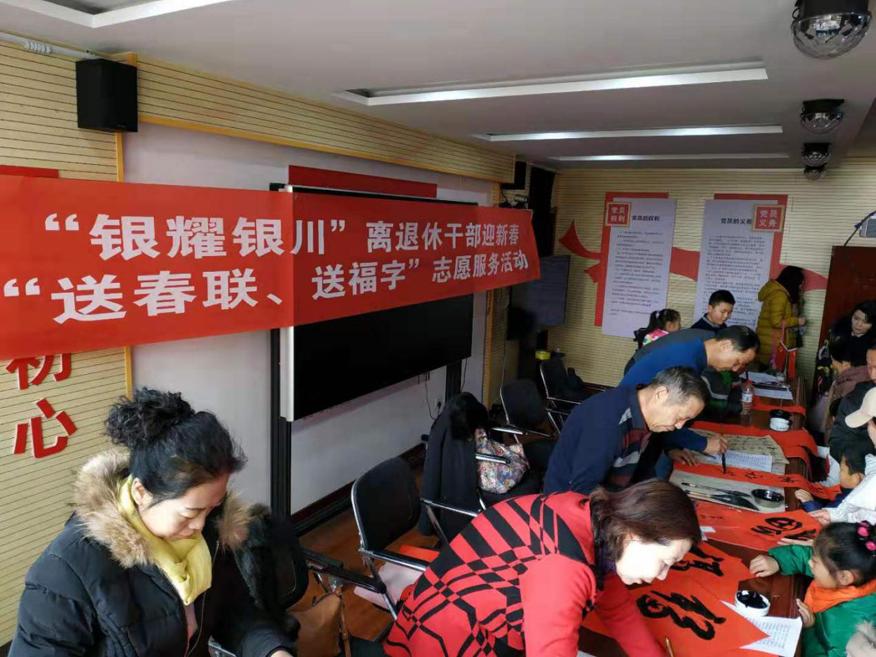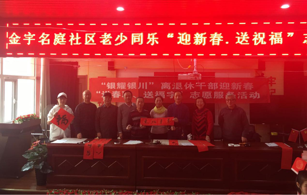金猪辞旧岁,玉鼠迎新春。在这个辞旧迎新,万象伊始的欢乐时刻,银川老年大学书画学会、“三缘型”书法和绘画党支部志愿服务队组织开展了以“银耀银川”迎新春“送春联、送福字”为主题的志愿服务活动,分别向离退休干部、在校学员、社区居民和送上新年祝福。 本次活动从2020年1月7日开始,连续进行了三天。银川老年大学书画学会、三缘型书法和绘画党支部志愿服务队的部分书法家们分别在校内、保伏桥新村社区、金宇名庭社区的现场挥毫泼墨,书写春联。楷、行、隶、草等多种书体各显神韵,“国富民强万物盛,人和家兴百业昌”“庚年有庆猪辞岁,子夜无声鼠报春”等喜气祥和的春联一气呵成,通过一幅幅、一方方充满新春祝福的春联、福字,写出了对美好生活的憧憬和向往。自活动截止,书写并送出的春联达920幅、福字500幅。活动现场一度热闹非凡,热情的居民们现场选取中意的书体,有的当场挑选春联内容,享受银川老年大学书法家的“定制服务”,书法家有求必应,让每个到场的居民都领取到了满意的春联。居民们脸上洋溢着幸福的笑容,纷纷感谢银川老年大学书画学会开展了本次送春联活动,让他们提早感受到了喜悦的节日氛围,同时更为欣赏到美丽优雅的书法陶醉赞叹不已。 这三天的活动充分展现并弘扬了银川老年大学“三缘型”党支部书法绘画组成员积极参与热情服务的精神,将老有所为的服务宗旨贯彻始终,为社区营造了浓厚的过年气息和良好的文化氛围,用书写春联的方式表达了对离退休干部和社区居民的美好祝福。 银川老年大学书画学会的“银耀银川,送春联、送福字”的活动在春节前夕还将继续下去,为银川市各社区送上新春祝福,传递中华书法国粹,满足居民的精神文化需求。