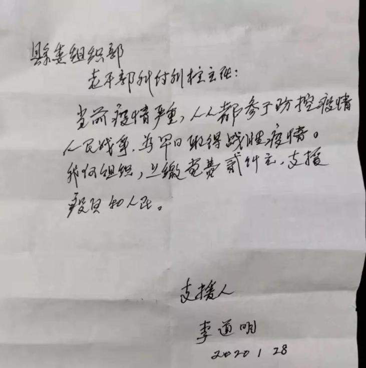 2月1日下午,一位耄耋长者走进吉林四平伊通满族自治县委组织部——上交了一笔2000元的特殊党费。 “我是卫生局的离休干部,这是我给组织写的一封信,今天把它交给组织。”老人从贴身的衣兜里小心翼翼地掏出了信纸和用信纸裹着的2000元钱——信中写道:当前疫情严重,人人都参与防控疫情人民战争。为早日战胜疫情,我特向组织上缴党费两千元,支援疫区和人民。支援人:李道明。 县委组织部的同志介绍了事情的来龙去脉——这位李道明老人今年已经有88岁高龄,1954年入党,是一名有着66年党龄的老党员,离休前任原县卫生局副局长,现任县委老干部局县直部门老干部联合党支部书记,曾获得全省离退休干部“好书记”荣誉称号。多年来,老人退休不褪色,始终关心和支持县域经济社会发展,当前肆虐的新型冠状病毒疫情更牵动着这位老党员的心。他主动联系县委组织部,上交这笔2000元的特殊党费。老人眼含泪花,动情地说:“看到电视上播报的疫情,我知道咱们的国家遇到困难了!我已经上了年纪不能到一线去,但作为一名老党员,我也可以做点什么。这2000元钱作为一笔特殊的党费,上交给党,支援疫区人民,我们共同努力,共克时艰!” 老人的眼里闪着泪花,但那份勇毅和笃行却鼓舞着每一个人。他告诉我们,众志成城,一起战“疫”,我们一定能赢! |