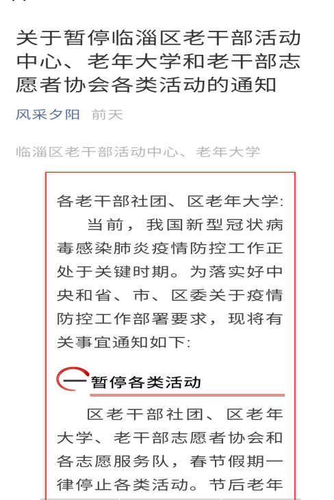 在当前新型冠状病毒感染的肺炎疫情防控工作形势严峻之际,淄博临淄区委老干部局迅速行动,认真落实中央和省、市、区委疫情防控部署,针对离退休干部年龄较大且免疫力较低,受感染风险较大的特点,立即采取措施,防止新型冠状病毒感染的肺炎在老干部群体中蔓延。 一是第一时间调整加强节日期间值班力量。疫情信息披露后,临淄区委老干部局第一时间调整加强了节日期间的值班力量,局主要负责人坚持春节假期全程值班一线、靠前指挥,局副科级干部一律提前停止休假、到岗到位,密切关注疫情态势,掌握全区老干部系统疫情防控工作情况。1月29日,局全体工作人员结束休假,全员到岗投入工作。 二是及时下发通知暂停各类离退休干部活动。及时向各离退休干部党支部及区老年大学(区老干部活动中心)下发了《关于暂停我区各类离退休干部活动的通知》,要求暂停全区各类离退休干部活动。区老年大学、社区老干部活动中心(室)一律暂停开放,何时恢复活动根据情况另行通知。并耐心细致向老同志做好解释工作,取得理解和支持。 三是发挥离退休干部党支部战斗堡垒和先锋模范作用。要求全区各离退休干部党支部和离退休干部党员充分发挥关键时刻战斗堡垒和先锋模范作用,按照中央和省市区疫情防控应急的要求做好各项工作,减少外出和聚集活动,不外出旅游、探亲访友,不组织、不参与聚会、聚餐。 四是引导离退休干部党员为疫情防控工作增添正能量。及时通过微信群、QQ群、电话等管道向离退休干部通报全省全市及临淄区疫情防控的最新进展和要求,引导他们不信谣、不传谣,充分发挥老同志的影响力和示范带动作用,积极传播正能量,积极支持做好疫情防控工作。 |