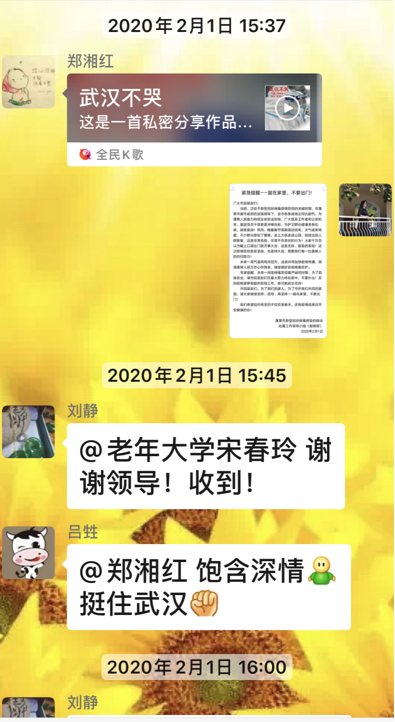 面对严峻疫情,烟台蓬莱市老年大学迅速行动,通过多种形式,用心用情打好抗击疫情阻击战。 拜年问候送温暖 2月3日开始,老年大学以电话、微信等形式,传达问候,摸清健康情况、叮嘱有关事宜,把温暖送到学员心坎上。 “给您拜年啦,特殊时期不出门不聚会,宅家抗疫情。”“请大家勤开窗透透风,勤洗手,勤消毒,出门一定要戴口罩。” 这些,是校方发布的信息。而学员的回复,更是给力。 “这个特殊时候,接到校领导问候电话,倍感亲切,心里暖融融的。”“收到,感谢大学考虑这么周全,让我们有种家人的感觉。”“请放心,我们一定听党和政府的话,居家自行隔离,不给国家添乱。” 打开全校57个群,类似内容至少发布100多条。期间,收到学员感谢短信500多条。 线上开课再学习 连日来,老年大学以网络教学为主阵地,引导学员参加线上学习,确保足不出户,学习、战“疫”两不误。 “如今,我都快成网络主播啦。”电钢琴班的任课教师蔚栋说。虽然人在外地,却心系学员。从8号开始线上教学,天天不落。他在家提前录制好视频,每天发班级群,并督促学员打卡练琴。 对此,学员宁秀娟深有感触。 每天,根据教师的安排,认真练习提高琴艺。她坦言:“没想到抗疫在家,课程不减学业不误,这得感谢大学的精心安排。” 现在,老年大学的声乐、书法绘画、瑜珈、非洲舞等30多个班次实现网上授课,参加学习的学员有800多人次。 电钢琴班学员 宁秀娟 发挥作用聚力量 老有所学、服务社会,这是蓬莱老年大学办学理念。面对疫情,学校组织引导学员们将学习心得,转化为服务社会的能量,为抗疫尽心出力。 “希望学员们发挥特长,为抗疫加油鼓劲。”当校方的号召发出后,立即得到学员们热烈响应,教师们也纷纷参与进来。 由此,拉开了文艺形式助力战“疫”的序幕。 这些天,老年大学工作人员的手机响个不停,大多是学员咨询交流、发送作品的信息。有的学员挥毫泼墨,绘制作品,致敬前线勇士;有的学员创作快板,表达对党的感激对祖国的祝福;有的学员敲起非洲鼓,声声昂扬激越,传递抗疫的信心和决心…… 目前,师生创作主题作品100多个,为打赢抗疫阻击战聚民心提士气鼓斗志,展现了新时代老年大学学员风采。 老年书画研究会会长李愿基 花鸟班教师张文业作品 非洲鼓班班委綦连凤 古筝班学员张艳芝 |