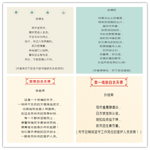 莫道桑榆晚,“抗疫”霞满天。新冠肺炎疫情发生以来,济南市广大离退休干部不忘初心、牢记使命,在做好自身防护的同时,以捐款捐物、志愿服务、创作文艺作品等多种形式,为打赢疫情防控阻击战做贡献。 捐款捐物显大爱。在疫情面前,广大离退休干部纷纷表示希望能为抗击疫情尽自己的一份力量,自发向各级慈善总会、单位党组织及所在社区捐款捐物,为共同抗疫贡献自己的一份力量,彰显人间大爱。 市中区广大离退休干部纷纷捐款,助力战“疫” 以95岁高龄离休干部姜嵩和91岁高龄离休干部李文为代表的市中区广大离退休干部,时刻关注疫情发展情况,当看到湖北地区疫情防控物资短缺的新闻后,纷纷慷慨解囊,有的嘱托家中儿女用微信转账捐款,有的直接拿着现金联系所在支部捐款,短时间内56位老干部捐款共计41900元。 济南市人民医院离退休职工自发捐款28566.66元 济南市人民医院离退休职工自发捐款28566.66元,历下区鞭指巷社区老年人大学教学点的老师学员们自发捐款9100元…… 历下区鞭指巷社区老年人大学教学点老师学员们捐款9100元 槐荫区退休党员彭佐生捐款10000元 历下区退休党员耿汝泉捐款10000元 槐荫区振兴街街道新兴社区第二监狱宿舍党支部副书记彭佐生,曾荣获“山东省劳动模范”“全国五一劳动奖章”“全国优秀驾驶员”等荣誉称号,向社区捐款10000元;历下区84岁退休老党员耿汝泉,拄着拐杖来到历山名郡社区捐款10000元……他们以实际行动诠释了“爱心无价,真情无声”的人间真情。 章丘区、天桥区、商河县等离退休干部纷纷捐款 章丘区绣惠街道回北村95岁高龄的离休教师刘清健,因个人腿脚不便,委托家人向党组织递交了1000元的“大额党费”;天桥区人大常委会原主任范广福向区红十字会捐款1000元;商河县麦丘文化展览馆党支部书记、退休干部杨培卿通过县慈善总会捐款1000元……全市各级离退休干部、党员等纷纷把爱心汇聚成一股合力,共同助力抗击疫情取得最后胜利。 志愿服务做贡献。疫情发生以来,济南市广大离退休干部积极参与社区联防联控工作,或入户调查、摸底排查、检测体温;或通过电话、微信、短信等方式,为居民普及防疫知识,让大家在重视防疫工作的同时消除恐慌;或在路口检查来往车辆人员,进行安全巡逻,严格把守社区出入关卡,对外来人员、车辆进行劝离,助力筑起疫情防控的坚强防线。 天桥区“枫叶大篷车”老干部志愿团在行动 天桥区“枫叶大篷车”老干部志愿团积极配合街道社区携手“战疫”,通过入户调查、电话排查等方式对返济人员进行摸底排查、为居民普及防疫知识;勇挑重担,对辖区楼院、背街小巷进行消毒;组织捐款捐物活动,助力疫情防控一线。 平阴县环秀社区第九网格党支部召开疫情防控推进会 平阴县环秀社区第九网格党支部10名退休老党员、老干部们主动担任小区楼组长,配合社区做好人员信息登记和防疫知识宣传,在小区值班执勤力量严重不足的情况下,自发成立“退休党员突击队”,召开疫情防控推进会议,通过佩戴党徽袖标、重温入党誓词,提振士气,让党徽闪亮在抗击疫情一线。 莱芜区羊里镇镇机关老干部支部书记钟恒春在执勤(右一) 今年71岁的莱芜区羊里镇镇机关老干部支部书记钟恒春,组织支部老党员充实值班值守队伍,配合社区开展防疫工作,因过度劳累住院治疗诊断为轻度脑血栓,但他心中牵挂疫情防控工作,住院仅五天即强烈要求出院并返回了值班岗位,其奉献精神感人至深。 济南市传染病医院退休老党员冲锋在战“疫”一线 全市新冠肺炎定点收治医院——济南市传染病医院有着34年党龄的退休老党员赵林,疫情期间肩负全院氧气供应工作,不分白天黑夜,每天需要装卸氧气瓶100个,重达2吨多,他一个人硬生生开辟了抢救危重感染病人生命的直通车。还有一位33年党龄的退休医师闫玉萍,曾参与“非典”期间发热门诊诊疗工作,积累了丰富的经验,这次疫情爆发,她又主动申请到一线临床工作,展现了一位老党员的初心和奉献。 钢城区里辛街道西田庄村老党员在执勤 钢城区里辛街道西田庄村53年党龄的“优秀共产党员”刘孝明、50年党龄的退休老教师郑星纯、25年党龄的党小组长刁启宝等一批老党员积极响应党的号召,站到抗击疫情第一线,披星戴月上岗执勤,为村党支部树起一面面不倒的“旗帜”。 市老干部艺术团志愿者在行动 市老干部艺术团的苏乐仁、刘红两位团员,得知小区物业不健全、居委会人手力量不足,主动请缨,志愿承担每天为社区喷洒消毒的任务,为家园坚守起最后一道防线! 文艺创作鼓士气。济南市广大离退休干部,积极用文艺创作的形式贡献自己的力量,用文艺作品激励斗志、坚定信心,为奋战在抗击疫情一线的英雄们敲战鼓、鸣战歌、增士气、鼓斗志。 “银发助力·齐心战疫”银铃寄语作品 2月9日,市委老干部局在全市范围开展“银发助力·齐心战疫”银龄寄语活动,短短几天就收到各区县、市直各部门老同志来稿300余篇,充分展示出济南市广大离退休干部齐心战疫的热情。 广大离退休干部书画抒情、助力战“疫” 市直部门离退休干部活动骨干书法培训班、章丘区书法家协会新世纪书画艺术会、历下区明湖书画院等团体的老同志积极响应号召,满腔热忱抒发情怀,创作书画作品300余幅;平阴县退休医师刘云贵围绕“众志成城、抗击疫情”