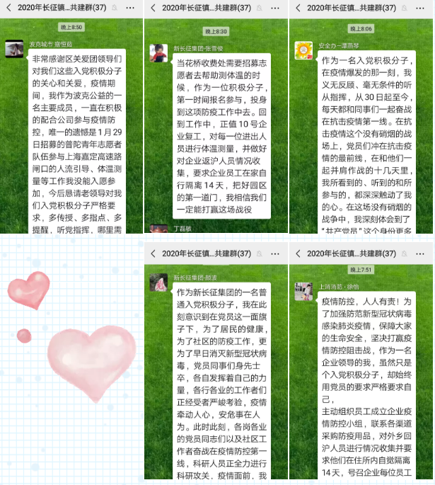 这是一次别开生面的启动, 我们在战疫阻击的火线结对; 这是一次非同寻常的启动, 我们在防控疫情的战场共建! 在防控疫情的关键时刻,上海市普陀区关工委和长征镇入党积极分子新一轮结对共建活动启动了!这次的结对共建活动与往常活动有些不一样。面对疫情,区关工委的老同志与长征镇入党积极分子通过微信工作群,开展了“云里牵手同战疫,隔空对话共守城”线上结对共建活动。 在微信工作群里,老同志为入党积极分子上“枫叶红微党课”; 入党积极分子在群里参与互动,发表感言。 老青结对,从火线启动;青年培训,在战壕开班。在防控疫情第一线考察积极分子,在阻击冠毒最前沿淬炼入党初心。 老同志汇聚晚晴能量,用言传身教为年轻一代树立模范榜样,提供有益的引导和帮助。“枫叶红微党课”激励新发展党员在抗疫工作中发挥先锋模范作用,老同志的贴心话鼓舞大家砥砺前行。 普老助战贴心话 ——致长征镇结对共建新党员 叶红 疫情就是命令,防控就是责任。诠释“初心使命”,党员更是先锋! 传递正能量,汇聚精气神;乐当志愿者,守牢防控门;管好自己人,做好自己亊。 一个党员一面旗,众志成城战疫情! 于生 当下,虽然疫魔肆虐,疫情严峻。但我们坚信,有党的坚强领导,有国家的综合实力,有人民的无穷智慧,有华夏的民族精神,定能魔高一尺,道高一丈! 人心齐,泰山移。冬天阻挡不住春天的脚步,阴霾遮挡不住太阳的光芒。赤县神州定会降妖除魔,春暖花开。 让我们一起努力,战胜疫魔。中国必胜! 陈蘅华 疫情防控阻击战,是一场没有硝烟的人民战争。 你们年轻人在防控一线战疫情,冲在前沿,深入社区,坚守阵地,严把大门。向你们学习,向你们致敬! 望你们多保重,自珍重,保护自我! 游华基 听党话,跟党走,党叫啥就干啥! 你们践行誓言,不辱使命,冲在一线,防控疫情;我们听党号召,宅在家里,管好自己,闷死新冠。 你我同心同德战疫魔,齐心协力降瘟神! 葛希美 一场突如其来的疫情震惊了整个世界,一场没有硝烟的战争正在打响! 党员带头,专家带头,医务工作者带头,冲向了第一线,为打赢这场战争不惜牺牲生命,令人感动! 你们年轻党员坚决听从党召唤,挺身而出,无私无畏,战斗在疫情防控阻击战最前沿。可敬!可赞!可叹! 上海加油!武汉加油!中国加油! 季秋芬 冲锋陷阵在战场, 青年党员皆好样。 不忘初心斗疫魔, 不辱使命勇担当。 桑榆宅家心向阳, 不出门户等曙光。 远离病毒保健康, 配合祖国打胜仗。 您我同心驱瘟神, 祝愿您我都无恙! 袁芳荣 沧海横流,方显英雄本色;疫情肆虐,更显党员风采。 抗疫战疫,共产党员责无旁贷要冲在最前线;防疫阻疫,共产党员义不容辞要坚守关键岗位;排查疫情,共产党员就应该挺身而出,深入社区,深入基层…… 哪里最危险,党旗就应当在哪里飘扬;哪里最艰苦,党徽就应当在哪里闪亮! 李凤吾 军医、中医、西医,三医斗厉疫! 陆军、海军、空军,三军送瘟神! 火神山、雷神山、钟南山,三山镇妖仙! 党心、军心、民心、三心稳神州! 领导开学致辞 区委老干部局、长征镇的相关领导也在微信工作群中讲话,感谢老党员的付出,鼓舞正在疫情防控战线上拼搏的入党积极分子。 区委老干部局副局长、区离退休干部党工委副书记(兼)丁磊敏: 在当前疫情防控关键时期,感谢区关工委启动与长征镇入党积极分子结对共建活动;感谢长征镇各位领导对这项工作的重视和支持,积极搭建老青结对线上交流平台;感谢各位青年入党积极分子,因为此时此刻你或许在居民区开展挨家挨户登记、排查工作,通知居民购买口罩事宜等等;你或许在商务楼宇进行企业复工人员登记、排查工作,宣传解释疫情防控注意事项等等;你或许已经奔赴在各行各业疫情防控生产一线。 这场人民战“疫”,我们老同志与各位青年入党积极分子在一起,老青云里牵手同战疫,网上结对共守城。相信有你们青年干部舍我其谁的担当精神,有我们老同志的助力战疫贴心话,我们有信心、有能力战胜这场疫情。 向你们致敬! 长征镇党委副书记徐军: 在疫情防控的特殊时期,我们火线开班。一场突如其来的新冠肺炎疫情让我们过了一个难忘的春节,我们奋斗在社区、排摸在楼栋、守卫在门岗……一起和时间赛跑,一起同疫情决战。抗击疫情就是淬炼干部队伍的试金石,面对疫情,我们年轻干部更需要拿出”赶考精神”,在自己的岗位上担当作为,在社会的层面上积极奉献。抗击这次的新冠肺炎我们要做好打持久战的准备,希望大家继续积极投身疫情防控工作,以实际行动在抗疫一线践行初心使命,锤炼舍我其谁的担当精神,以求真务实的工作态度,交出一份优异的”勇者答卷”。同时感谢区关工委老领导对年轻干部的关心和关爱,也恳请老领导对年轻干部继续严格要求,多传授、多指点、多提醒。 晚晴寄语 区关工委关爱工作团团长叶红: 在全国人民众志成城打赢防控新冠肺炎疫情人民战争之时,我们普陀区关心下一代工作委员会的老同志非常高兴在线上与大家见面!疫情就是命令,防控就是责任。我们在抗疫火线中启动老青结对,互帮互学;在抗疫战壕里开展党课培训,交流切磋;在抗疫实践中淬炼初心,坚定信念。我想这一定会成为2020年老青结对活动难忘的一页! 青年朋友们,疫情防控阻击战,是一场没有硝烟的人民战争,也是考验每个共产党员和入党积极分子的关键时刻。越是关键