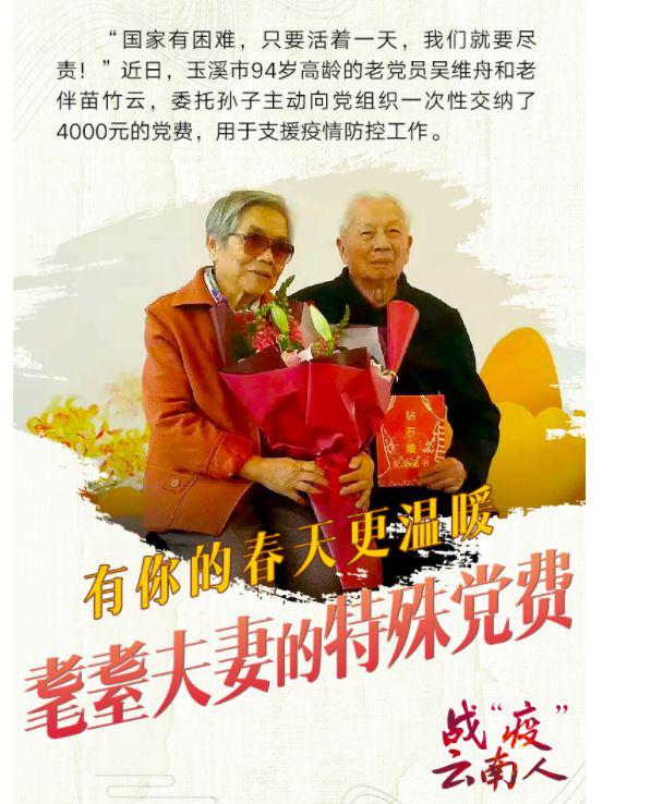 新冠肺炎疫情爆发以来,云南玉溪市离退休干部迎“疫”而上,纷纷征战“疫”线、解囊捐款、笔墨抒情,用奉献和担当谱写一曲曲爱的赞歌,用逆行和爱心浇铸出一张张亮丽名片,用坚守和付出筑起一道道“银色堡垒”,擦亮了“碧玉生辉”离退休干部志愿服务品牌。 征战“疫”线 闪耀银发风采 疫情发生以来,全市广大老党员老同志纷纷披挂上阵,走上抗击疫情第一线。 “这久你们辛苦啦!如果人手不足,请召唤!不计报酬,义务参与。”澄江县疾控中心退休干部刘彩琼向组织“请战”。“干了30多年,一遇到疫情总感觉自己有责任!”她的话语朴实动人。 通海县委政府职工住宅区没有物业、防控漏洞大,老党员李学辉组织20名老同志在小区门口建立临时党支部,每天坚持测体温、做登记,守护着群众的健康。在新平县水塘镇,72岁的退休干部陶自林拉着音响走街串巷,宣传疫情防控知识。 “我是党员我先上”,在元江县曼来镇,老党员张有华每天骑着摩托车穿梭于大街小巷,挨家挨户发放《致全镇人民的一封信》《健康科普小知识》等宣传资料。他组织老党员工作室3名同志参加值勤,并慰问检查点工作人员。这段时间,社区有两位老人相继去世,张有华第一时间赶到丧主家中,劝导家属从简办丧、为疫情防控“让路”。接地气,有担当……深受感动的乡亲们问他哪里来的干劲,他说:“共产党员不能忘记初心使命,关键时刻要冲在第一线守护群众。” 牵挂“疫”线 捐献滚烫爱心 一方有难,八方支援。全市广大离退休干部纷纷慷慨解囊,奉献爱心。 “国家有困难,我们就要尽责。”94岁高龄70年党龄的离休干部吴维舟和老伴苗竹云,第一时间向党组织交纳4000元党费,支援疫情防控。孙女、孙子受到教育纷纷捐献爱心。 市场监管局87岁老党员史继华交党费5万元助力战“疫”。“这些钱4月份才到期,现在国家有难,我提前取出来交给组织。”市卫健委86岁老党员段淑慧交党费2万元,段老说:“我曾长期在哀牢山中最艰苦的村卫生室工作,丈夫车祸残疾一直呆在家,是党培养锻练了我,给了我力量,才有了今天的幸福生活。”市委党校87岁离休干部刘宽交党费5000元。 易门县老干五总支5名党员捐款1600元,老党员郑光荣交2000元党费。老党员唐瑞丽把自己留存的10 个口罩送给值守一线的同志。她说:“我宅在家里可以不戴口罩,他们奔波在前线,不能没有防护。”新平县平甸小学94岁的冯骐和90岁的孙丽琼夫妻捐款2000元。 声援“疫”线 唱响必胜之歌 连日来,广大老同志用笔墨鼓舞人心,用诗文抒发心声,表达战“疫”必胜的信心和决心。 讴歌祖国、礼赞英雄。孔祥庚在《新年感赋》中写道:“神州挽臂心相系,此际人天一志同。”周葵创作诗歌《挺起民族的脊梁》,向钟南山等奋战一线的“逆行者”致敬,先后被多家媒体转载。王洪君在《战瘟神》中写道:“同舟共济,中国精神。党心广远,大爱永恒。”欧正义写道“白衣天使挑天命,黄鹤楼前战鬼魂。”余庆廷创作楹联:“院士许身,医生请命,部队驰援,警方亮盾,鼎力齐挥征疫剑;中华靖难,武汉清和,病魔败退,市井重光,樽醇满渗讨妖功”。 传播知识,科学防控。谢光廷创作楹联:“戴口罩,勤洗手,方能去病;常通风,少出门,定可弃疾”。李荃生创作《抗击新冠肺炎顺口溜》。麻旺喜创作《助力疫情防控三字经》,他说:“宅在家里也能参战!为抗击疫情贡献绵薄之力!” 鼓舞人心、提振信心。刀正昌创作《万众一心防肺炎》,用三弦调傣语演唱。张有华编写歌曲《疫情防控 人人有责》,通过广播以本地彝话进行传唱。刘燕创作《梅花总会露芬芳》等歌曲,并且自己录音传唱,受到很多老年朋友的欢迎。 老同志们还纷纷以书画、散文诗、剪纸等形式,致敬奋战在防疫一线的战士们。 |