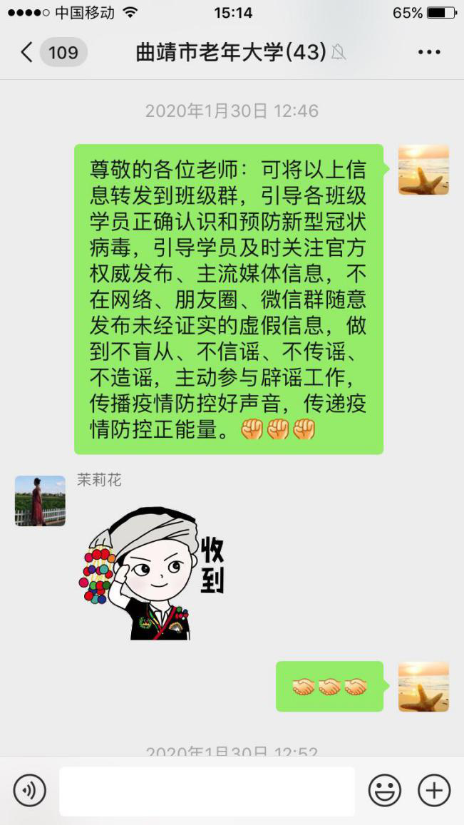 自新型冠状病毒感染的肺炎疫情防控工作启动以来,云南曲靖市老年大学广泛动员、迅速行动,针对老年学员免疫力弱,容易感染这一实际,周密制定防控措施,积极做好各项防控工作,为打赢疫情防控阻击战贡献力量。 织密一张“防控网”。及时成立疫情防控工作领导小组,建立领导带班、相关人员值班制度,明确联络员,确保干部职工守土有责、守土担责、守土尽责。建立 “四级联防机制”(即学校统筹、教师联络服务、班干部牵头负责、学员积极参与),明确职责,确保疫情防控期间,战斗上下齐心、工作落实到人、任务层层推进。 建立一份“健康表”。及时对全校4098名在校学员、59名教职工的健康状况、旅行使进行全覆盖摸排,做到底数清、情况明。建立一份健康状况登记表,对学员是否出现发热、呼吸困难、肌肉酸痛、恶心呕吐、拉肚子等症状进行详细登记,坚持每日跟进、每日统计、每日汇报,做到“早发现、早报告、早隔离、早治疗”。 发放一封“公开信”。及时发放《给全校师生的一封信》,广泛号召学员不恐慌、不传谣、不信谣,积极发挥学员尤其是学员党员的作用,充分发挥学校特设党组织战斗堡垒和学员党员先锋模范作用,力所能及多做正面宣传引导,最大限度消除社会恐慌,维护社会大局稳定,积极为打赢疫情防控阻击战增添正能量。在学校号召下,学员们积极响应,学员党员戴上党徽,主动参加到小区张贴宣传单、出入人员检查、测量体温和劝导活动中。 用活一个“微信群”。发挥“互联网+”优势,用好用活管理群、教师群、班级群等微信群。明确专人负责,在微信群内及时发布疫情防控重要通知,宣传疫情防控防护知识,并对各种不实消息辟谣,引导干部职工、广大老年学员正确认识新型冠状病毒感染的肺炎,掌握个人防护、居家防护和工作防护的基本知识,熟悉正确的就医流程,做到不走亲访友、不集会聚餐,少去人员密集场所,出门戴口罩,勤洗手、勤消毒、勤通风,保持良好卫生习惯。 每日一次“大消毒”。采取有力措施,加强校区管控,切实守好“大本营”,为“复学”做足准备。组织人员每天对校区所有公共区域的走道、门把手、卫生间、垃圾桶、电梯等部位进行消毒处理。设置检查站对所有进出人员进行体温测量登记和消毒,要求所有出入校区的人员必须配戴口罩,必须扫码“云南抗疫情”小程序后方可进出。建立废弃口罩回收站,坚持每天对使用过的口罩进行专门消毒处理。 |