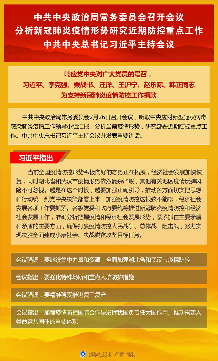 中共中央政治局常务委员会召开会议 分析新冠肺炎疫情形势研究近期防控重点工作 中共中央总书记习近平主持会议 响应党中央对广大党员的号召,习近平李克强栗战书汪洋王沪宁赵乐际韩正同志为支持新冠肺炎疫情防控工作捐款 新华社北京2月26日电 中共中央政治局常务委员会2月26日召开会议,听取中央应对新型冠状病毒感染肺炎疫情工作领导小组汇报,分析当前疫情形势,研究部署近期防控重点工作。中共中央总书记习近平主持会议并发表重要讲话。 响应党中央对广大党员的号召,习近平、李克强、栗战书、汪洋、王沪宁、赵乐际、韩正同志为支持新冠肺炎疫情防控工作捐款。 习近平在会议上发表重要讲话指出,当前全国疫情防控形势积极向好的态势正在拓展,经济社会发展加快恢复,同时湖北省和武汉市疫情形势依然复杂严峻,其他有关地区疫情反弹风险不可忽视。越是在这个时候,越要加强正确引导,推动各方面切实把思想和行动统一到党中央决策部署上来,加强疫情防控这根弦不能松,经济社会发展各项工作要抓紧。各级党委和政府要统筹推进新冠肺炎疫情防控和经济社会发展工作,准确分析把握疫情和经济社会发展形势,紧紧抓住主要矛盾和矛盾的主要方面,确保打赢疫情防控人民战争、总体战、阻击战,努力实现决胜全面建成小康社会、决战脱贫攻坚目标任务。 会议强调,要继续集中力量和资源,全面加强湖北省和武汉市疫情防控。要巩固排查和收治成果,切实控制传染源、切断传播途径。要夯实社区排查和防控基础,抽调更多干部支援基层,支持各类在当地的干部积极投身社区防控工作,充分调动群众自我管理、自我服务的积极性,加快补齐老旧小区在卫生防疫、社区服务等方面的短板,深入细致做好群众基本生活保障工作,加强思想政治工作,加强群众心理疏导。要加强重症患者救治,促进高水平团队协同攻坚、多学科专家联合攻关,发挥好重症专业救治力量作用,提高临床治疗精准性、有效性,努力降低病亡率。要及时收治轻症患者,及早实施医疗干预,尽量减少轻症转为重症。要着力提高医用防护物资调拨和配送效率,畅通渠道和堵点,尽快将急需物资送到救治一线。要加强北京等重点省份防控工作,坚决阻断各种可能的传染源。 会议指出,要强化特殊场所和重点人群防护措施。养老、救助、儿童福利、精神卫生医疗等机构,人员密集、环境封闭,相关服务对象自身防护能力弱,要压实属地责任,实施更严格的管理措施,防止外部传染源输入,对已感染患者要全力救治。要加强疫情防控一线工作人员、直接接触医用废弃物人员、密闭空间服务人员等人群的防护,有针对性落实防控措施。 会议强调,要精准稳妥推进复工复产。各级党委和政府要把支持复工复产、恢复和稳定就业、畅通交通运输、保障市场供给等各项工作做细做扎实。要督促企事业单位严格执行疫情防控规定,落实防控主体责任,积极帮助企事业单位解决防疫难题,协调解决口罩、消毒用品等防护物资不足问题,指导制定符合单位自身特点的防控规范。对复工复产中出现的个别感染病例,应急处置措施要科学精准。要提高复工复产服务便利度,取消不合理审批。要把各项惠企政策尽快落实到位,完善政策配套实施办法,在一体化政务平台上建立小微企业和个体工商户服务专栏,使各项政策易于知晓、一站办理。要总结经验,把一些好的政策和做法规范化、制度化。 会议指出,加强疫情防控国际合作是发挥我国负责任大国作用、推动构建人类命运共同体的重要体现。要继续同世界卫生组织紧密合作,同相关国家密切沟通,分享防疫经验,协调防控措施,加强对外宣介和公共外交,共同维护地区和世界公共卫生安全。 会议还研究了其他事项。 |