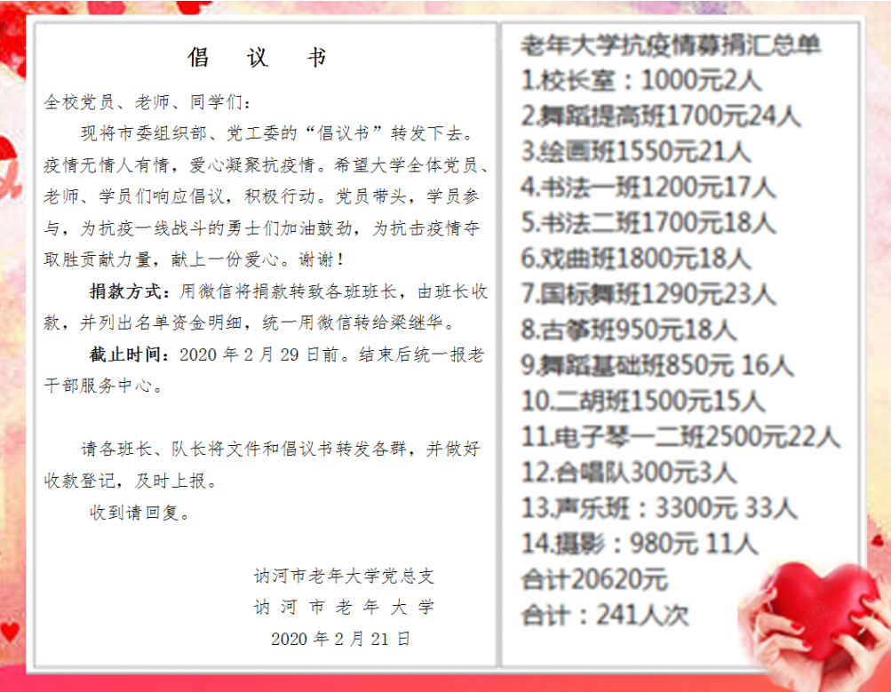 “国家危难之时,我们老年大学也要积极行动,疫情特殊我们不能冲在防疫一线,但也要尽点绵薄之力。”新型冠状病毒感染的肺炎疫情出现以来,严峻的形势牵动着讷河市老年大学全校师生们的心。 2月21日,讷河市老年大学积极响应号召,助力疫情防控。大家通过微信、转账等方式开展捐赠活动,全校师生众志成城,尽一己之力汇聚了一条抗击疫情的爱心长河。截止到2月29日,收到241人次捐款,共计20,620元,已全部捐到讷河市红十字会,用于支援我市抗击新型冠状病毒疫情工作。 “大家积极行动起来,响应学校号召!携手共进,为抗击疫情贡献一份力量!”梁校长在教师班长微信群里发起号召。