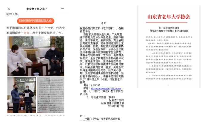 面对新冠肺炎疫情的严峻形势,岱岳区委老干部局把疫情防控、维护稳定作为当前压倒一切的重大政治任务,坚决贯彻落实习近平总书记重要指示精神和中央、省市区委决策部署,扛起责任担当,多措并举、上下联动,做到守土有责、守土担责、守土尽责,助力坚决打赢疫情防控阻击战。 压实“责任网”,上下联动防控 局主要领导高度重视,成立疫情防控工作领导小组,明确责任分工,严肃工作纪律,保持应急状态。采取加强健康防护知识宣传、充实全天值班力量、老干部活动场所暂停开放、疫情防控日报告、异地返回人员居家隔离5项措施,从严从实做好疫情防控工作。成立两套工作组、三套台账参与社区“双报到”疫情联防联控,严把小区出入口,把党旗插在战“疫”第一线。积极开展爱心捐款助力战疫阻击战,老干部局18名党员干部自发捐款7500元,用于新冠状病毒的防治,用自己的实际行动践行了党员的责任和担当。 垒起“能量网”,积极投身战斗 通过微信、工作群、电话等方式积极倡导老同志居家自防,不给国家添乱、不给子女添忧、不给自己添病。引导老同志力所能及发挥作用,许多老同志心系战疫,发挥特长,以笔为援,用诗歌书画助力疫情防控,宣传防控知识,创作了一批快板、顺口溜、三句半等群众喜闻乐见的作品。许多老党员主动捐款捐物,有的自愿请缨到一线参与联防联控。 织密“关爱网”,实施精准服务 向全区52个部门和11个镇街下发通知,要求各单位利用微信、工作群、电话等形式,全面了解离退休干部的身体状况、家庭生活情况、生活中存在的困难,以及对全区防控疫情工作的意见建议。针对空巢、独居、失能及有特殊生活困难的老同志,给予关心照顾,帮助他们解决急、难、愁等问题,让老同志在疫情面前安心暖心舒心。开展“网上”组织生活,在远程教育平台开展自主学习,通过微信、学习群等加强政治学习和教育引导,提醒老同志不信谣、不传谣、不造谣。 |