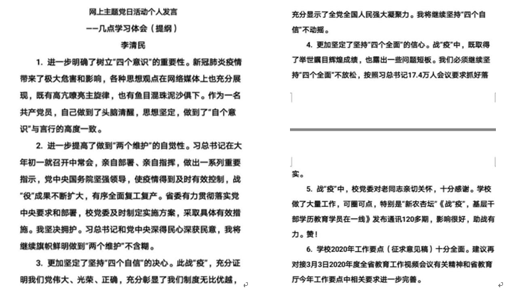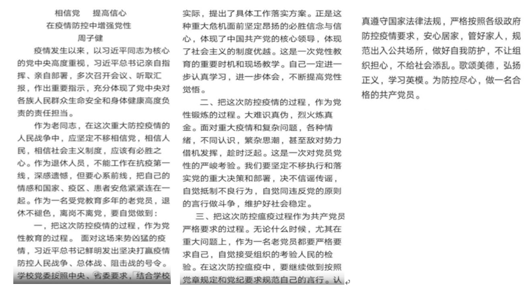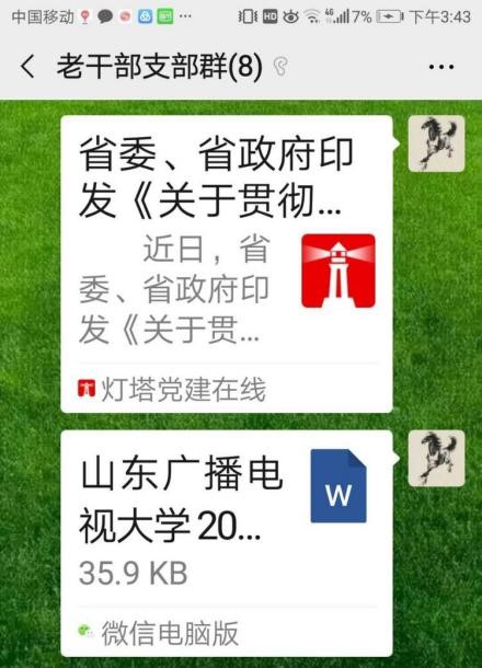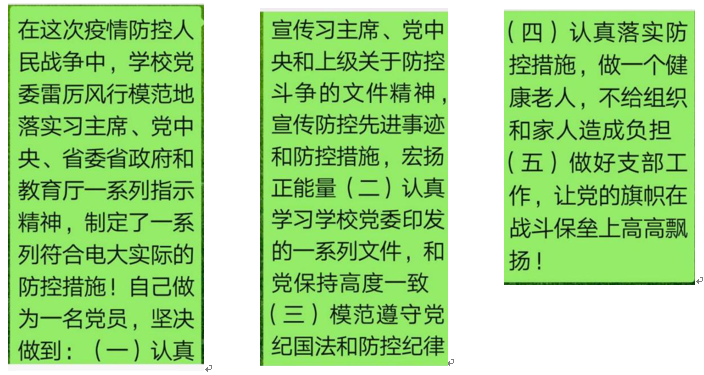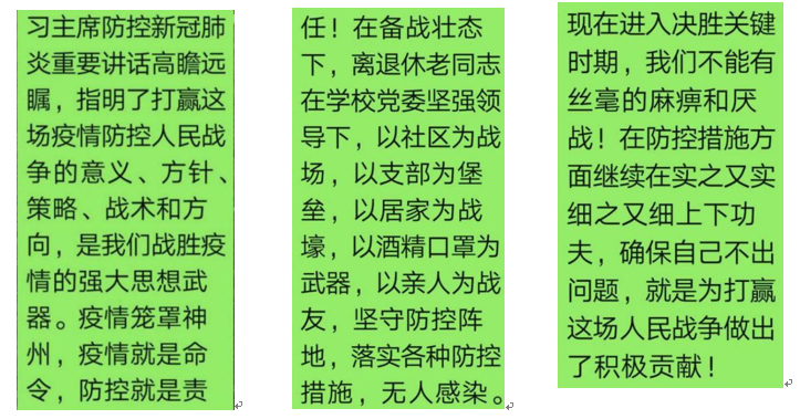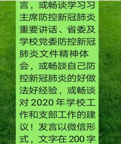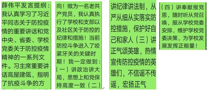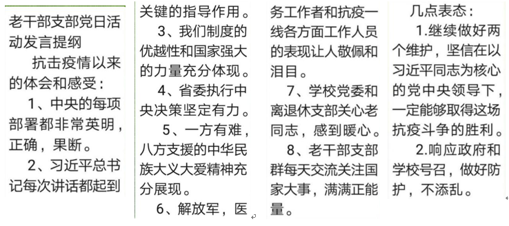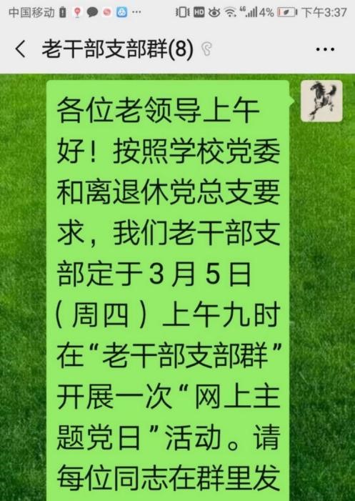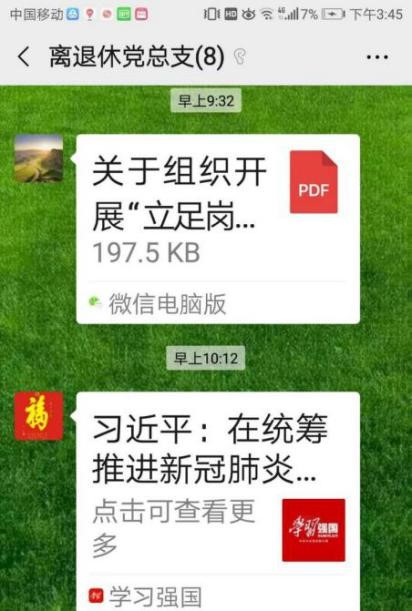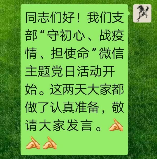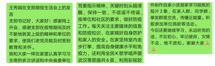 编者按:离退休老干部党支部利用微信开展主题党日活动,充分考虑了老党员年龄大、行动不便、居住分散、疫情防护等实际情况,创新了党建活动载体。这次微信主题党日活动富有成效,是老干部党支部党建工作“支部建在网上”的积极探索。 2020年3月5日上午,老干部党支部按照学校党委和离退休党总支的要求,利用微信群召开了“守初心,战疫情,担使命”主题党日活动。疫情就是命令,防控就是责任!离退休老同志代表王秀娟、李清民、薛伟平、刘方惠、周子健、王泺民、李军、陈骥等作了书面发言和视频发言,抒发了爱党爱国、战胜疫情的情怀。一、认真部署,充分准备