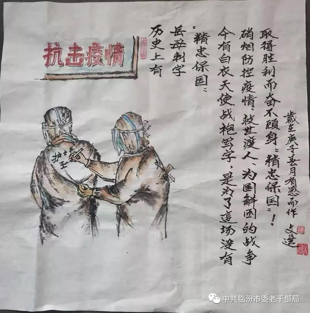 剪纸 翼城 刘峥嵘  绘画 吉县 谭文选 市直离退休干部党总支、党支部充分发挥模范先锋作用,响应倡议书、起草公开信、动员老干部,把聚力打赢疫情防控阻击战作为当前组织工作突出任务。市直84个党支部书记主动担责,每天给各自所在的支部工作群和家庭群、亲友群发布防疫知识、疫情防控情况和防护措施,做到重要信息第一时间传达,以自身的行动、党性威望进行舆论引导,坚定广大老干部战胜疫情的信心。 临汾市国资中心离退休干部认真贯彻落实疫情防控工作的安排部署,积极开展各项防控措施,按要求宅在家多通风、勤洗手、多消毒、不出门,在家争做火炬手。临汾市公安局离退休干部不断提升政治站位,始终关注疫情,充分发挥经验和优势,模范践行各项疫情防控工作要求,用实际行动教导子女,争做家庭防控的“指挥员”。尧都区老年大学学员、侯马市老年大学学员、乡宁老年大学学员以关注现实、聚焦当下、诗歌汇聚、书画创作的方式,为打赢疫情防控狙击战积极作为。安泽县离退休干部 “弘扬长者风范,当好防控“三员”,积极配合联防联控工作,用才艺作武器,以书画、剪纸、诗词、戏曲、朗诵、柔力球等多种形式,在微信群转发宣传,为奔赴在一线的逆行者加油鼓劲!洪洞县离退休干部群策群力、众志成城投入这场轰轰烈烈的群众战斗中,顶着寒风、守在村口,连夜编写快板彰显共产党员本色,为党旗添风采。 二、因地制宜 发挥党组织战斗堡垒作用 基层党组织是党全部工作和战斗力的基础。大事难事看担当,危难时刻显本色。在疫情防控阻击战中,临汾市离退休各支部强化党建引领,踊跃发挥力量,战斗在最前沿。他们设立党组织、组建突击队,凝心聚力、共克时坚。  1月26日,临汾市人民医院离退休干部第一党支部发来请战书,表示疫情当头,若有战、必召回、战必胜,坚决服从医院的安排,永远听从党的指挥。临汾市总工会离退休干部党支部积极响应市委老干部局号召,主动作为,积极防控,组织离退休干部党支部专人,通过市总工会离退休干部党支部微信群向离退休干部和退休人员转发并传达抗疫重要文件精神。古县离退休党支部通过各种形式线上传播正能量,点赞中央决策部署、讴歌一线人员、集中学习《新型冠状病毒感染肺炎防控知识手册》、朋友圈转发正能量信息,用实际行动支持疫情防控工作。浮山老干部局党总支在“学习强国”APP上成立了临时党支部,邀请老干部党支部支委参加进来,研究发挥支部战斗堡垒和党员先锋模范作用共抗疫情的方案。霍州、襄汾、翼城、隰县离退休干部党支部书记充分起到带头作用,通过微信群向广大老同志宣传疫情防控工作要求和相关知识,提醒老干部们做好自我防护,积极配合防控工作,树立起宅在家中就是为抗疫做贡献的思想。吉县、蒲县、永和老干部党支部书记带头动员广大老党员投身防疫前线,积极协助所在社区做好新型冠状病毒感染的肺炎疫情防控工作,主动担当起站岗执勤、防控知识宣传和来往人员信息登记工作等。乡宁、汾西、大宁、曲沃离退休干部党支部则是设立文艺队、宣传栏通过用书画、快板、歌舞等形式为一线工作者加油助威。临汾市各级离退休干部党组织构筑起老干部系统疫情防控的坚固防线。 三、热忱奉献 彰显共产党员政治本色 在这场严峻的斗争中,临汾市离退休干部党员报名在前、战斗在前、引领在前,冲锋在第一线、以身作则、模范带头,在党和人民需要的时候挺身而出、闪耀着共产党员不朽的光辉,彰显共产党员政治本色和过硬作风。  临汾市人民医院79岁退休老党员、老专家、原骨科主任李华老将不老,向临汾市人民医院支援湖北的34名医护人员捐出慰问款10.2万元。汾西县退休干部郭炎林带领合作社捐赠了50万斤玉露香梨,襄汾县90岁高龄离休老干部张有申自愿交纳5000元“特殊党费”为抗击疫情贡献自己的力量。洪洞县老干部梁吉祥每天给辖区80岁以上的老干部打电话,把防控知识手册发到每个同志的手里。吉县党群支部书记左拴红大公无私、先人后己坚持在社区当志愿者,协助社区和包联机关排查人员、登记信息、测量体温,劝导居民科学防控,宣传疫情防控知识,提高居民防控意识;76岁吉县原粮食局副局长谭文选抗疫期间创作书画作品上百幅为前线抗疫战士鼓与呼,并被“学习强国”学习平台采用,引起了强烈的反响。曲沃县老干部张承继同志撰写文章《老伴想当志愿者》、《我和孙女升国旗》,分别在《老友导报》、 “教科书苑”上刊登,表达了抗疫必胜,老干部众志成城的决心。刘明管同志策划、创作MV《战“役”之歌》,央视新闻移动网播放,转载达4000多次。还有许多的老党员自觉自愿为疫区捐款,支持抗疫工作。 在疫情防控工作中,临汾市离退休干部党员践行初心使命、体现责任担当,他们用无私无畏、甘于奉献的实际行动为党旗增辉添彩,为全市抗疫工作做出了积极的贡献!