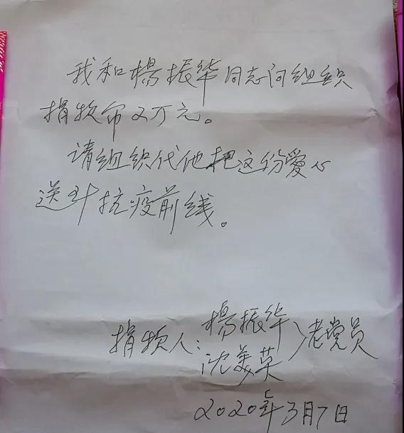 3月7日,玉溪市委离退休干部工委收到一笔特殊的捐款,沈美英老人代替1月份去世的丈夫杨振华捐款1.5万元,她自己捐款0.5万元。“如果老杨还在,他一定会第一时间捐款,我这是替他交上最后一笔‘党费’。”沈美英激动地说。 接过这笔沉甸甸的捐款,市委组织部副部长、老干部局局长、离退休干部工委书记周俊激动地说,“沈老,您的行为太让我们感动了,适当捐些就可以了。”沈老动情地说:“年龄大了帮不上忙,只能捐点款,表个心意,请你们一定转给抗疫前线。”朴实无华的语言,在场的工作人员为之动容。 据了解,杨振华生于1924年,1945年参加八路军洛南支队。此后,他走南闯北大半生,转战云南,走德宏,入保山,进版纳,最后落脚玉溪,先后担任原玉溪地区行署专员、玉溪地区人大工委主任。他热心公益,退休后多年从事关工委工作、在汶川地震等重大灾难中都踊跃捐款;他生活简朴,一件衣服穿了很多年,种植蔬菜花草都是自己亲自动手;他热爱学习,坚持每天读书看报,重点地方都用红笔标记出来,去世前还问:“我的参考消息怎么还没送来。” “在父亲和母亲的观念里,他们首先是一个共产党员,要用党员的标准严格要求自己。”杨振华的大儿子说。 总有一种精神让我们感动,总有一种力量激励我们前行。沈美英老人用真情大爱展现着老干部的宽广胸怀、用无私奉献践行着党员的初心使命,她坚定的理想信念和对党的事业无限忠诚,值得让我们学习、让我们敬重。 |