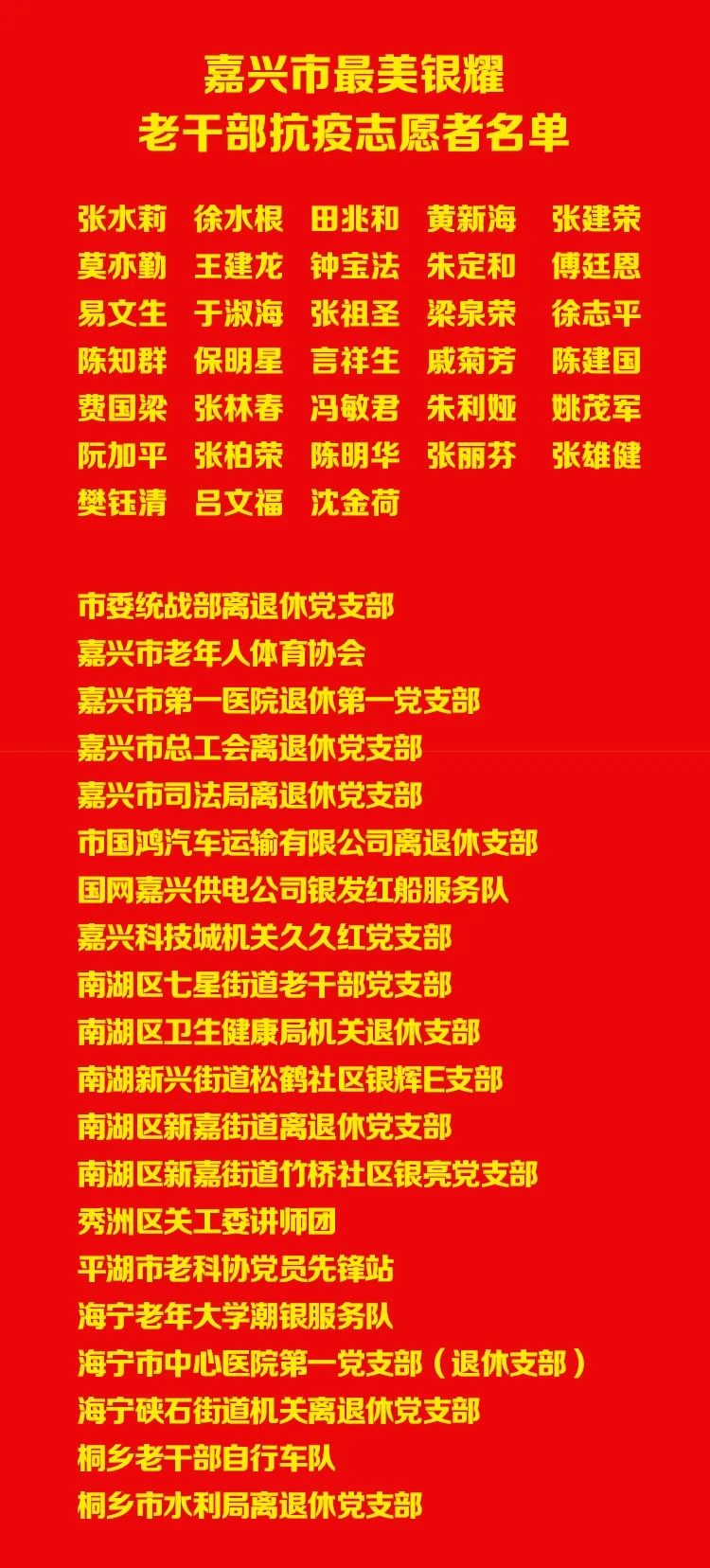 一场新冠肺炎疫情的暴发让人始料未及,面对疫情,嘉兴广大离退休干部作为“红船银晖”志愿者,主动担当,参与抗疫,涌现出了很多感人的故事。日前,省委老干部局向全省发出致敬“银耀志愿者”的活动倡议,嘉兴市委老干部局积极响应,认真排摸,经统计,有近万名老同志、老党员抗疫志愿者下沉9754个“微网格”,活跃在基层一线。这里,记录几个典型、感人的故事。 一、扛起“微网格长”责任的“最美银耀志愿者”。市司法局退休干部莫亦勤是天奥金域兰庭小区的“微网格长”,她研究并提出“发挥熟人熟地”的优势开展巡查,协助社区摸排,自1月31日起,主动报名,在社区卡点执勤,将家里86岁的老母亲托付丈夫照料,自己一门心思扑在工作上,一直坚持到现在。市总工会退休干部张建荣,被评为南湖区建设解道首批“优秀网格长”,疫情期间,他重点协助社区做好外来租户的登记、上门宣传和矛盾化解工作,一天不落巡值在社区一线,深得社区居民好评。 二、默默奉献为群众做好点滴服务的“最美银耀志愿者”。“就是为了让小区老人有新鲜蔬菜吃。”每天清晨7点,海宁军休所年过八旬的老干部陈明华就会骑上自行车出发,去地里采摘蔬菜。因道路封闭,他要绕行6公里,经过两处管控卡点,才到菜地,他将自己种的萝卜、青菜等各类蔬菜采摘好,再拿回家洗干净,按每袋3至4个品种,一袋袋分装好后,逐一逐户送到26户老人家中。一个多月以来,陈明华免费上门赠送新鲜蔬菜共计500余斤,让39位老人每天都能吃上新鲜蔬菜。收到陈明华蔬菜独居老人,年龄最大的已经92岁。 张秋荣是市公安局的退休干部,大年初三,张秋荣看到嘉兴市保安协会微信群里有会员单位发出了求助购买口罩相关信息后,立即想方设法联系购买了十万余只口罩,还有额温仪、酒精、消毒水等紧缺物质。当省协会告知省内有的保安公司缺乏口罩后,又多方联系为全省30多家保安公司解决了近八万多只口罩。