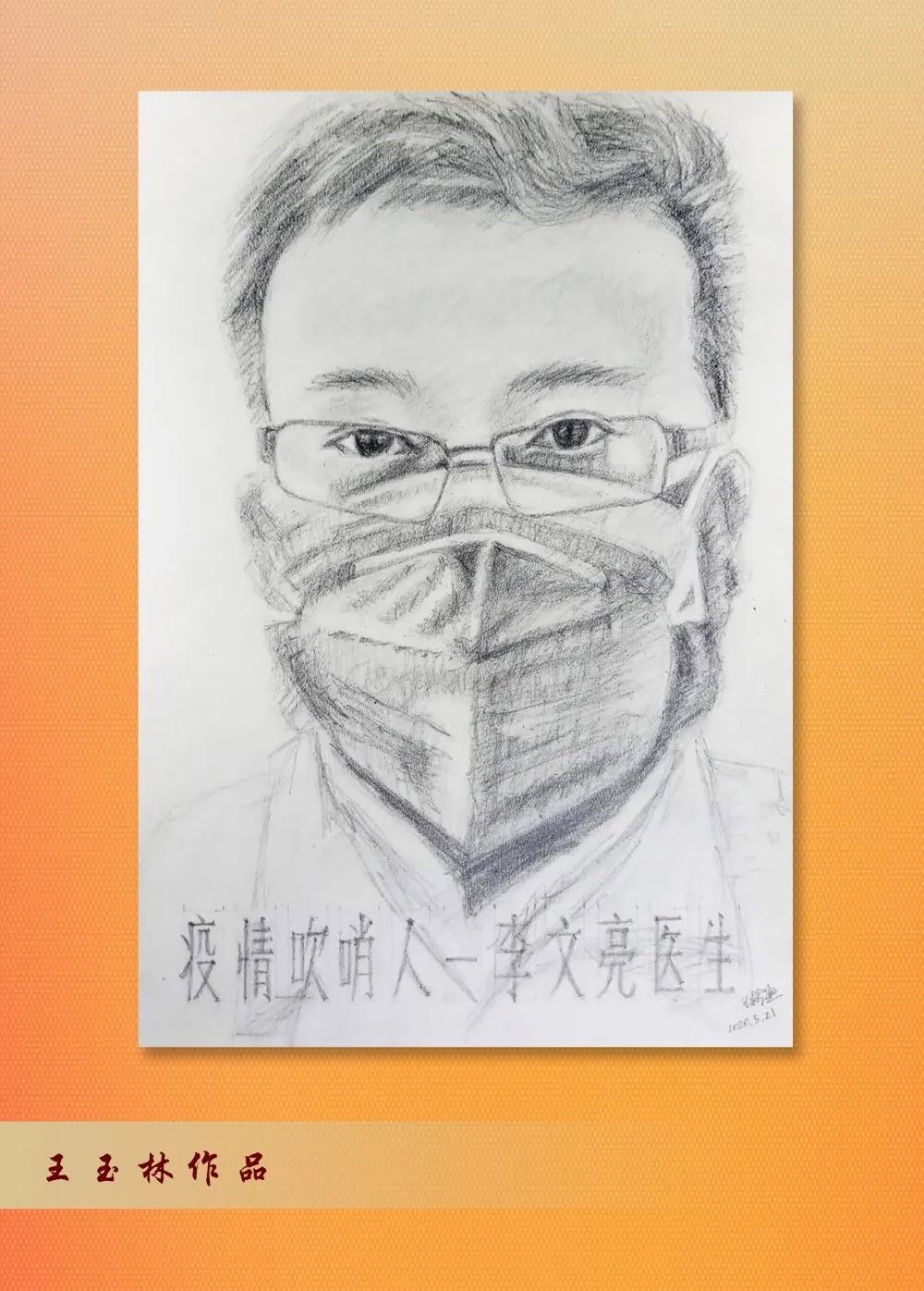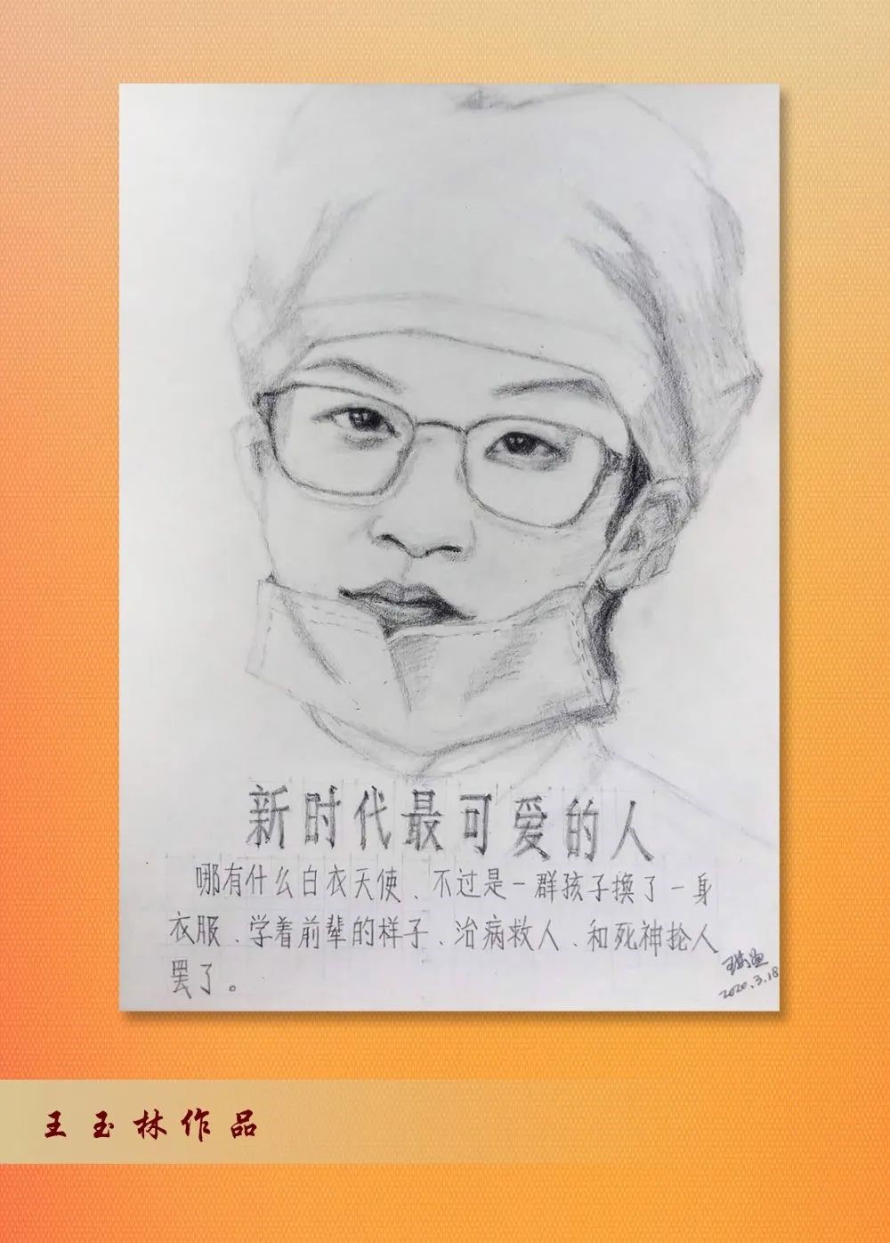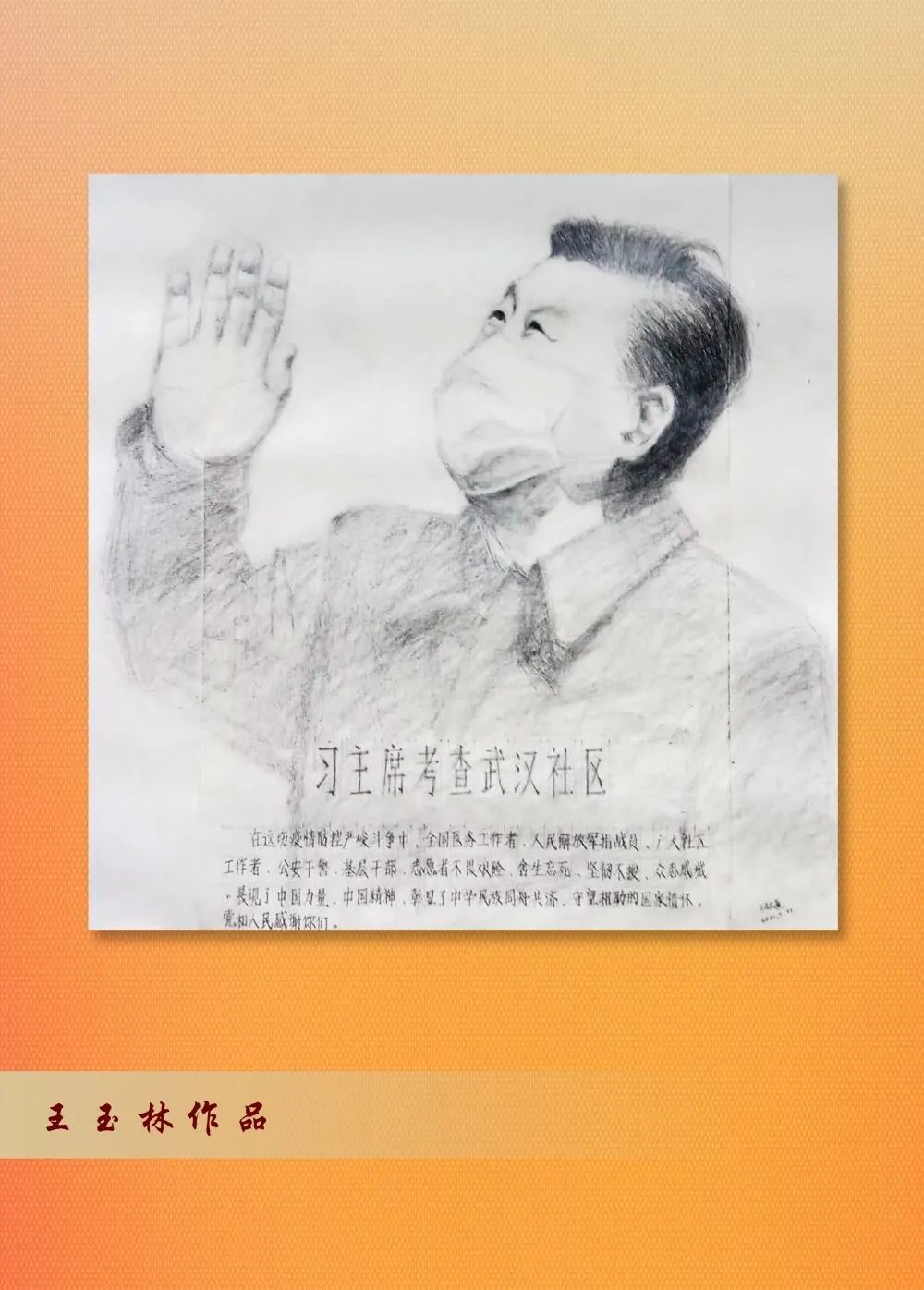 素描展 在这场突如其来的“人民战疫”中,无论身在“一线”,还是宅在家中,我们每个人都不是旁观者,更没有局外人。我们可能做不了“逆行者”,但可以做一名顺应抗击疫情浪潮中的“鼓动者”,主动配合疫情防控,积极发挥自身优势,为打赢疫情防控战贡献应有的力量。 市直部门离退休干部活动骨干培训班学员、市商务局离退休干部四支部委员王玉林同志在新冠肺炎疫情爆发后,利用自己业余爱好,拿起手中的画笔,历时近两个月,创作了十幅人物素描作品,为时代画像、为时代立传、为时代明德。 诗词作品欣赏