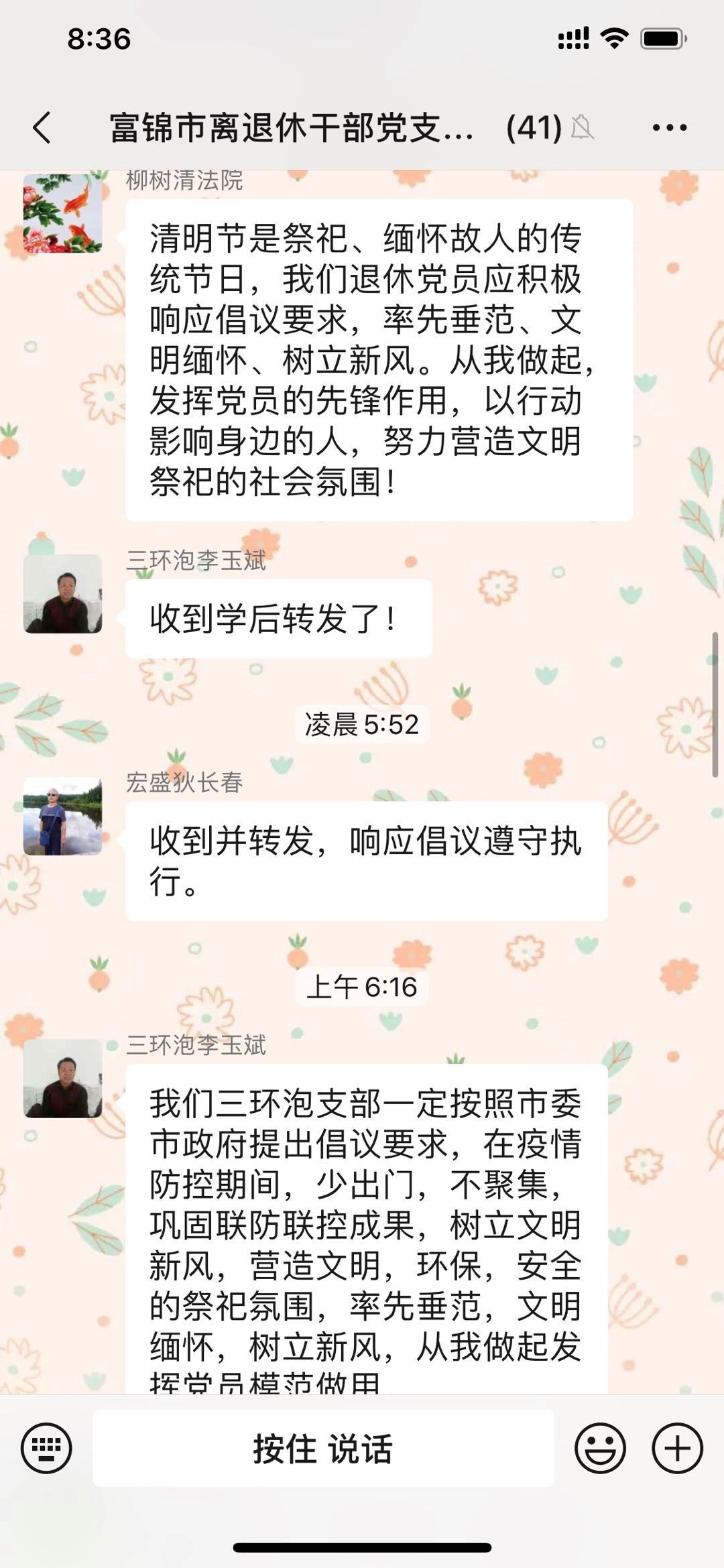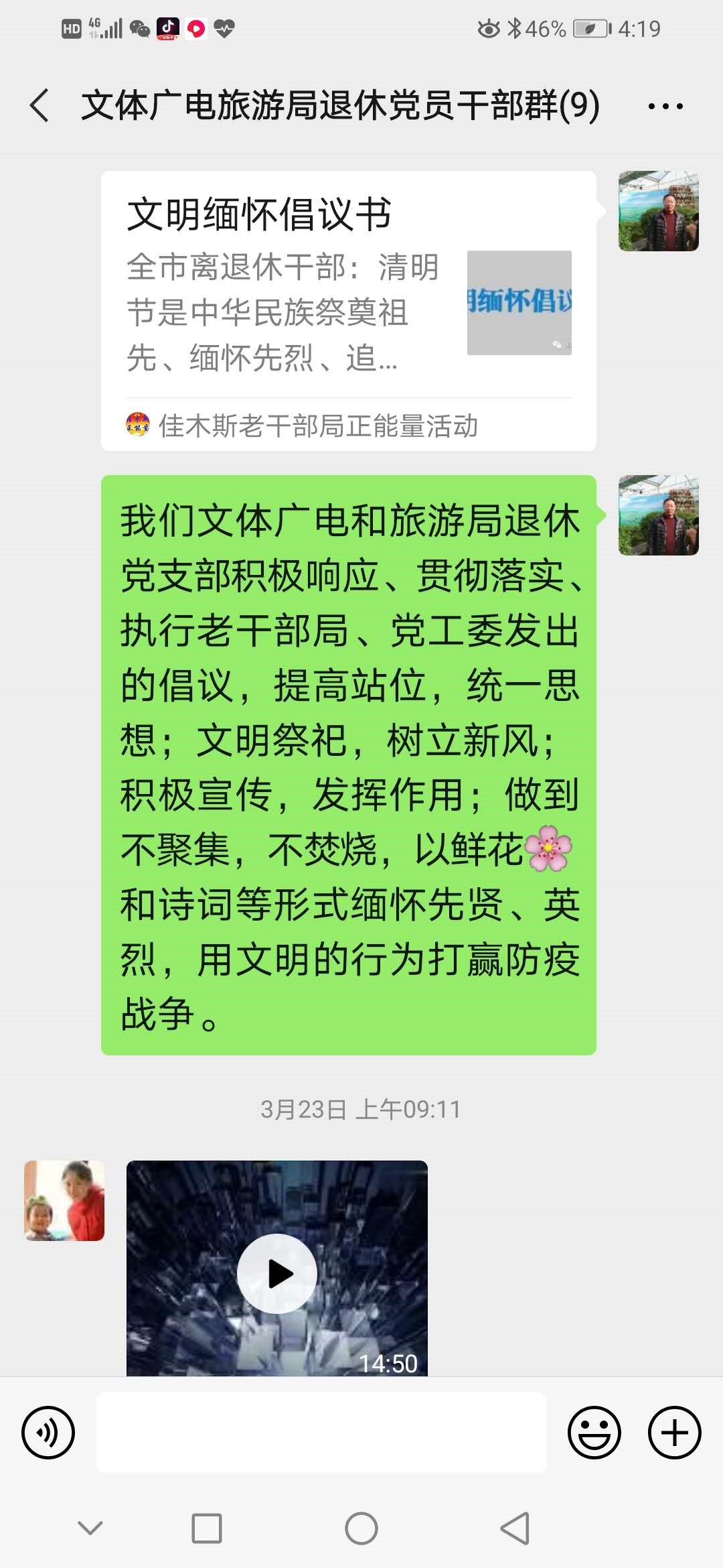 清明节是中华民俗中祭祀先烈、缅怀逝者、寄托哀思的重要节日。清明节临近,富锦市委组织部(老干部局)积极响应佳木斯市委组织部(老干部局)关于节日期间文明缅怀的倡议,大力倡导文明、环保、安全的祭祀,巩固联防联控成果,树立文明祭祀之风。 为了推行文明缅怀,倡导文明新风,维护优美整洁的市容环境,消除防控疫情期间的安全隐患,老干部局工作人员第一时间将文明缅怀倡议书转发到全市离退休干部党支部微信群,法院、文广新局、粮食局等40余个离退休党支部支部书记立即行动起来,在各自的党支部群转发,积极宣传,并纷纷表示坚决遵守执行,充分发挥党员的先锋模范作用,做文明祭祀的宣传员和监督员。 老年团体也积极响应文明缅怀号召,寄情书画表达追思,身体力行推行文明祭祀。省美术家协会会员、富锦市美术家协会副主席陈佰秋精心绘制了一幅国画,悼念战疫牺牲的英雄们。市地书协会创建发起人马永茂书写了多幅毛笔字作品,深刻缅怀周恩来总理、悼念战疫牺牲的白衣天使和战疫英雄李文亮。 通过开展多种形式的宣传活动,引导老同志带头弘扬中华民族的传统美德,争做移风易俗的推进者、文明祭祀的示范者,带头开展网上祭祀、“云祭扫”等文明祭祀活动。营造浓厚的社会舆论氛围,确保祭祀活动平安、文明、有序的开展。 |