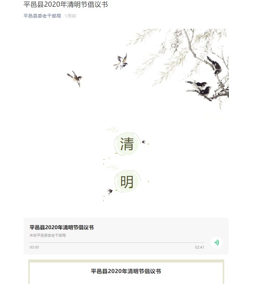 红色永传承”主题活动。 线上宣传倡新风 充分利用“平邑县委老干部局”微信公众号、微信工作群等方式向广大离退休老干部、老干部工作者宣传《平邑县2020年清明节倡议书》,倡导“文明祭扫平安清明”的理念,大力宣传疫情防控和清明节祭扫服务管理措施。 网上祭扫寄哀思