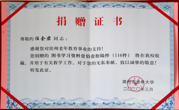3月31日,滨州市老年大学学员、滨医附院退休老干部任全君同志向学校无偿捐赠个人多年积累的绘画类学习图书116件。学校为任全君同志颁发捐赠证书。学校副校长朱见军,教务部门负责同志、书画系主任等参加。 学无止境、老有所为。今年87岁的任全君同志,主动来市老年大学联系捐赠事宜,表示愿意将自己心爱的积累多年的学习用书无偿地捐赠给学校,用于有关教学工作。任全君同志是滨州医学院的老干部,正高级职称、主任检验师,退休后,多年在市老年大学书画专业学习,与学校建立了深厚的感情,通过这次捐赠,一方面感谢老年大学对自己多年来的培养,另一方面为老年大学文化建设贡献力量。他用实际行动继承和发扬了无私奉献的优良传统,坚守初心和使命,充分展现了新时代离退休干部、老年大学学员的精神风貌。 |