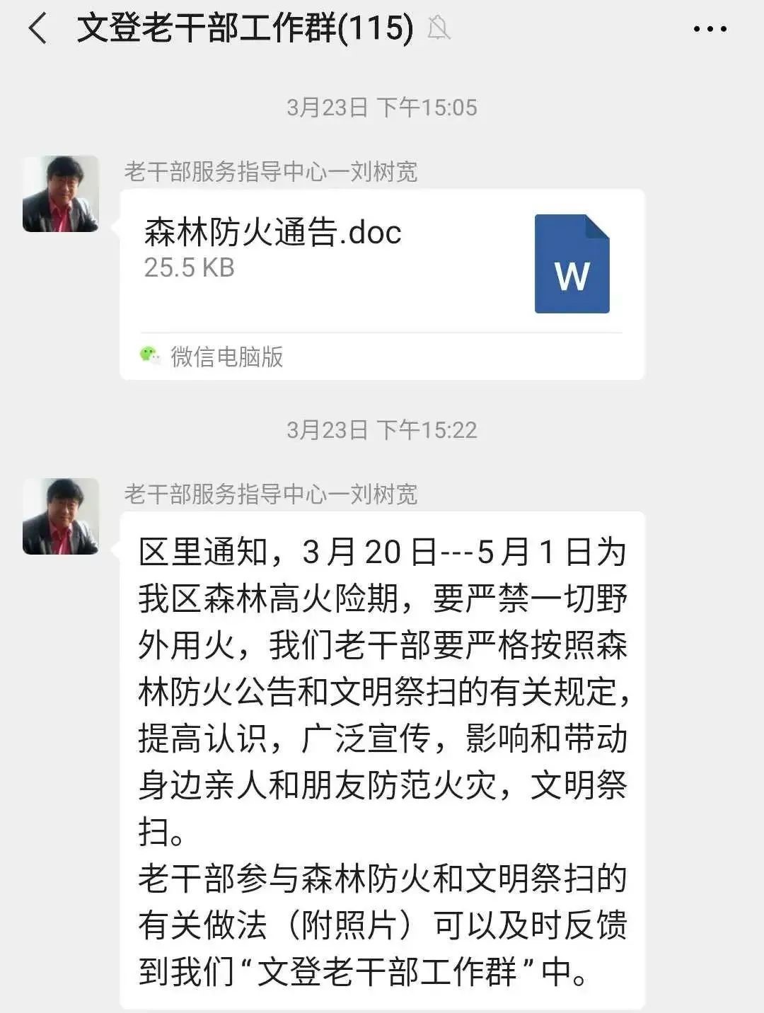 幸福不忘革命史,清明扫墓祭英烈。清明来临之际,威海市各级老干部工作部门积极倡树文明祭祀新风尚,并通过线上线下引导、参与志愿服务等多种方式,在弘扬优秀传统文化的同时,深切缅怀革命先烈,为绿色祭扫、文明祭扫贡献老干部的力量。 线上线下宣传树立新风尚 为倡导移风易俗,树立文明新风,全市各级老干部工作部门采取线上线下相结合的方式,主动加强文明祭祀的舆论宣传和正面引导。文登区、乳山市组织老干部通过微信工作群,广泛转发文明祭祀倡议书、森林防火等相关宣传资料,并组织离退休干部党支部收看护林防火工作新闻发布会直播,进一步强化文明祭扫意识。荣成市充分发挥老干部楼长作用,主动与社区对接,通过张贴宣传告示、入户分发《2020年清明节期间祭扫有关事项通告》等举措,大力营造文明绿色过清明的社会氛围。截至目前,累计派发宣传单页1250份,辐射17个城市社区2600户居民。高区、南海新区老干部利用社区公开栏、电子屏等,张贴标语、悬挂横幅,积极引导群众增强清明期间的安全意识和防火意识。 志愿服务联防督查破陋习