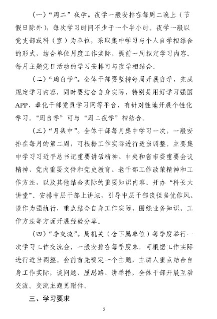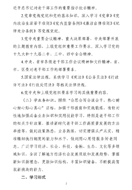 今年以来,宁波市奉化区委老干部局在做好疫情防控各项工作的基础上,围绕“会思会写会说会干,热心耐心细心贴心真心”的干部培养目标,结合工作实际,积极组织全体干部开展理论学习和业务培训,努力建设一支讲政治、守规矩、业务精、作风优、有温度的老干部工作队伍,为做好新时代老干部工作提供坚强的队伍保障。 No.1制定学习计划 强化学习目标 根据奉化区委有关工作部署,制定了《奉化区委老干部局2020年度干部学习计划》,建立“周二夜学”制度,同时以“周自学、月集中、季交流”为抓手,多措并举加强政治理论、业务政策学习,倾力打造学习型机关。 No.2创新学习形式 压实学习责任