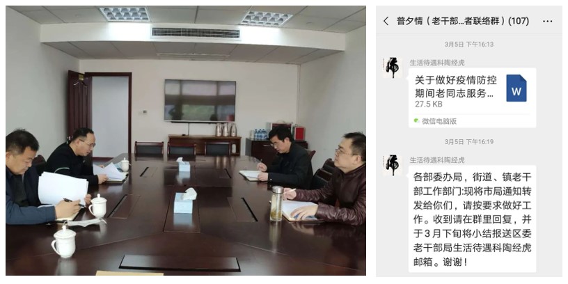 强化联络员制度 健全完善机关干部联系基层制度,加大对联络单位工作指导力度,“线下走访”转为“线上指导”,畅通工作“直线道”。 对疫情期间老干部丧事办理的最新要求,秉持从简原则加强工作指导,做到方式简化、关心不减。在疫情严重时期,信息反馈由“有情况报告”转为“每日一报”,确保老干部服务保障信息及时转达。 启动应急协商机制 普陀区委老干部局主动加强与民政、建管委、社区服务机构沟通,适时对老干部服务项目例如长护险、应急维修、实事项目等运行状况与存在问题进行协商。 对生活不能自理、独居等重点对象提前预判,提出“一人一册(策)”的应对方案,送上服务“及时雨”。