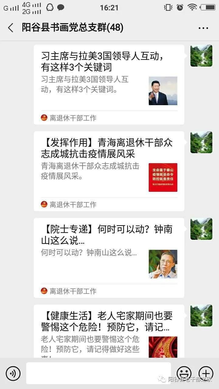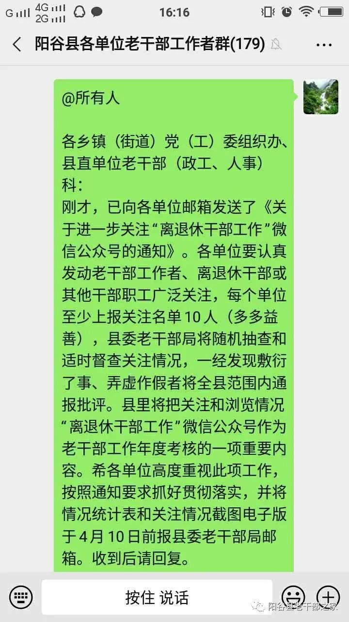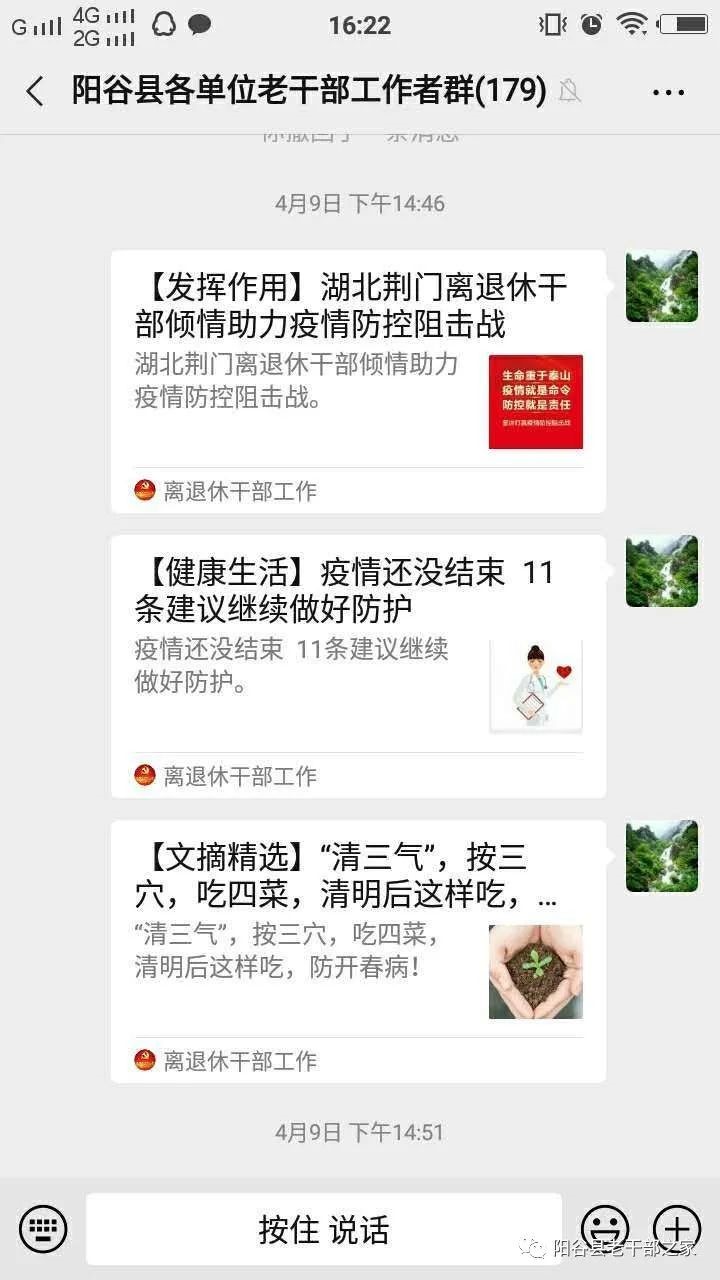 近日,山东省委老干部局通过“山东老干部”微信公众号平台发布《关于进一步组织广大老同志关注并用好“离退休干部工作”微信公众号的通知》。阳谷县高度重视,迅速行动,认真贯彻落实,全面部署发动,积极宣传引导,采取有力措施确保通知精神落到实处。截止到4月10日,全县已组织广大离退休干部和老干部工作者关注“离退休干部工作”微信公众号1020人。 第一时间传达。3月31日,在“山东老干部”微信公众号平台发布《关于进一步组织广大老同志关注并用好“离退休干部工作”微信公众号的通知》当天,阳谷县委老干部局专门下发通知,依托“阳谷老干部之家”微信公众号平台发布,强调关注学习“离退休干部工作”微信公众号的重要性,要求全县各乡镇(街道)组织办、县直单位老干部(政工、人事)科、离退休干部党组织认真发动老干部工作者和离退休老干部广泛关注,同时设计了《离退休干部工作微信公众号关注情况统计表》,要求各乡镇(街道)和县直单位4月10日前上报已关注公众号的离退休干部名单、电话及截图,县委老干部局将加强督导检查,电话随机抽查,并将关注和浏览“离退休干部工作”微信公众号情况纳入老干部工作年度考核的一项内容。 显著位置张贴。统一打印“离退休干部工作”微信公众号二维码,在县委老干部局、县老年大学、县老干部活动中心、干休所等离退休干部学习、生活等聚集的地方醒目位置张贴,对前来县委老干部局办理医疗报销等业务、干休所居住生活、县老年大学学习、老干部活动中心活动的离退休干部提醒指导关注,及时答疑解惑,手把手教离退休干部如何关注并使用“离退休干部工作”微信公众号,使老同志关注和使用公众号更为便捷、简单,得到离退休干部的认可和好评。 积极引导发动。各单位老干部工作者通过单位微信群转发“离退休干部工作”微信公众号二维码,发布关注公众号的详细教程。有的单位老干部工作者到离退休干部家中走访,发动离退休干部及家属进行关注,现场为离退休干部服务。各离退休干部党组织引导本支部离退休干部党员关注,支部书记、委员带头,离退休干部党员踊跃参与,并积极向家属、离退休干部群众宣传发动一起来关注和使用微信公众号,在全县掀起了关注使用“离退休干部工作”微信公众号的热潮。 学习蔚然成风。县委老干部局安排专人负责每天在“阳谷县各单位老干部工作者”“阳谷县离退休干部党总支”“阳谷县老年大学”等微信交流群转发“离退休干部工作”微信公众号刊载的重要言论和信息文章,及时向关注者推送,方便浏览学习。广大离退休干部通过微信公众号平台,及时了解习近平总书记重要指示精神和其他省市老干部工作动态,陶冶了情操,丰富了健康知识。阳谷县老年社团离退休干部党总支书记李奇说:“自从关注了公众号,每天我都能看到学习习近平总书记重要讲话和重要指示精神,进一步增强了‘四个意识’,坚定了‘四个自信’,提高了政治素质。”县农业综合服务中心退休干部程学信家属说:“微信公众号每天都刊登生活保健健康知识,浏览学习使我和老伴的身体越来越健康,为我们的晚年幸福生活提供了强有力的保障。”