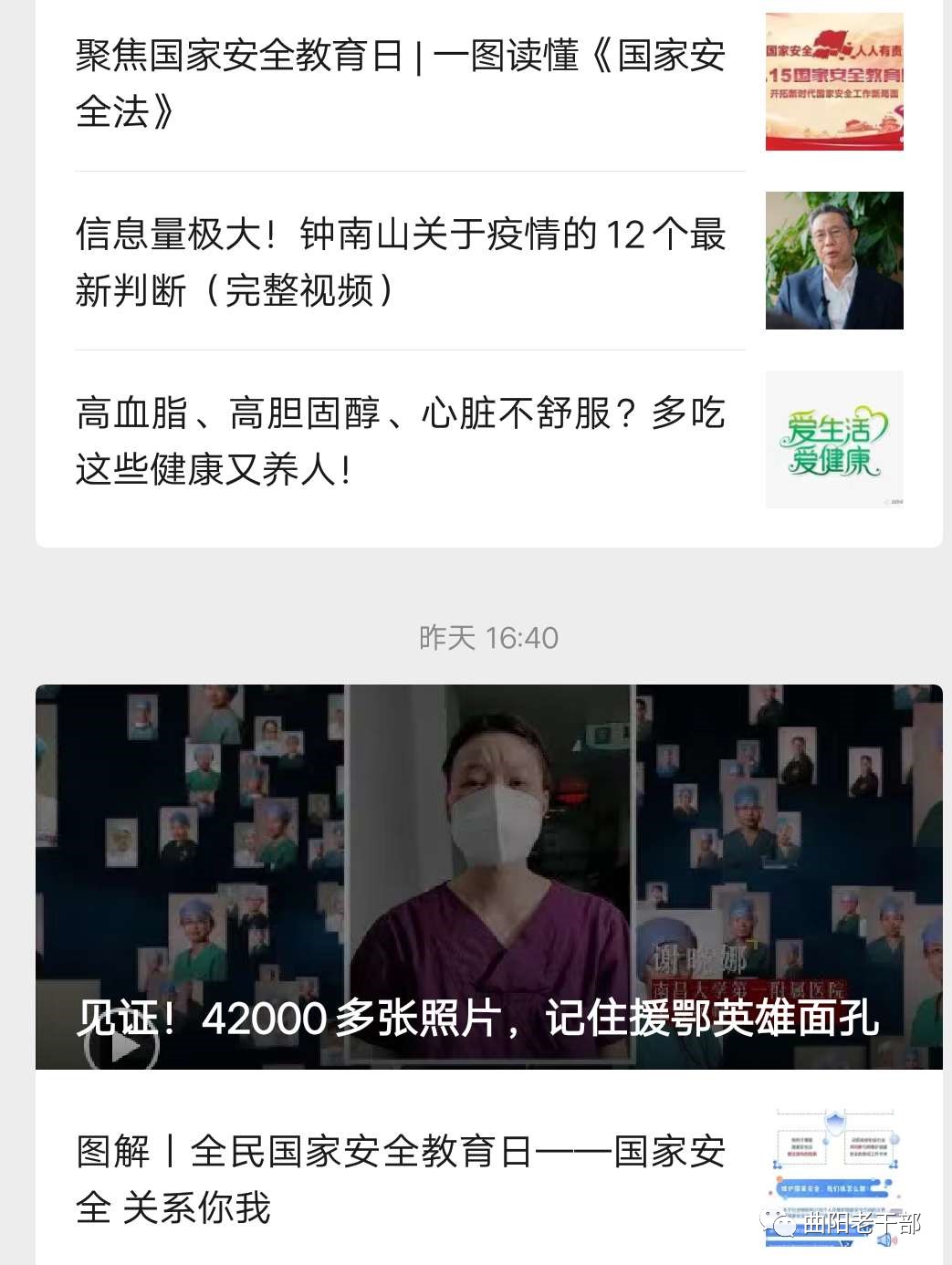 县委老干部局在“曲阳老干部”微信公众号开设了国家安全学习宣传专栏,从4月13日起,每天推送国家安全的有关知识,通过离退休干部党支部群、朋友圈等广泛转发,加强对离退休干部总体国家安全观的宣传力度,让老干部充分认识维护国家安全的重要意义,发挥老干部的优势和作用,为在全社会营造学习宣传总体国家安全观的浓厚氛围作贡献。 03观看一部宣传纪录片