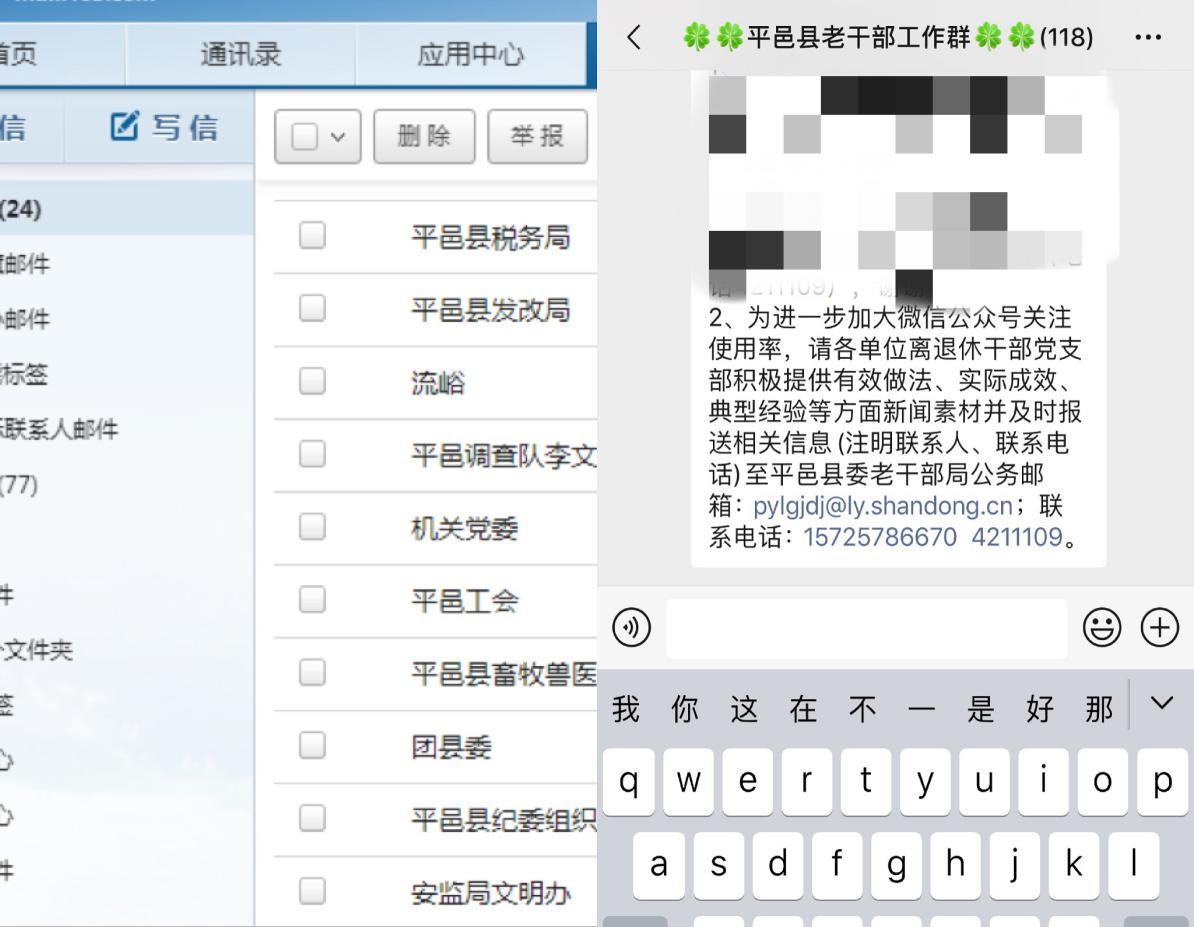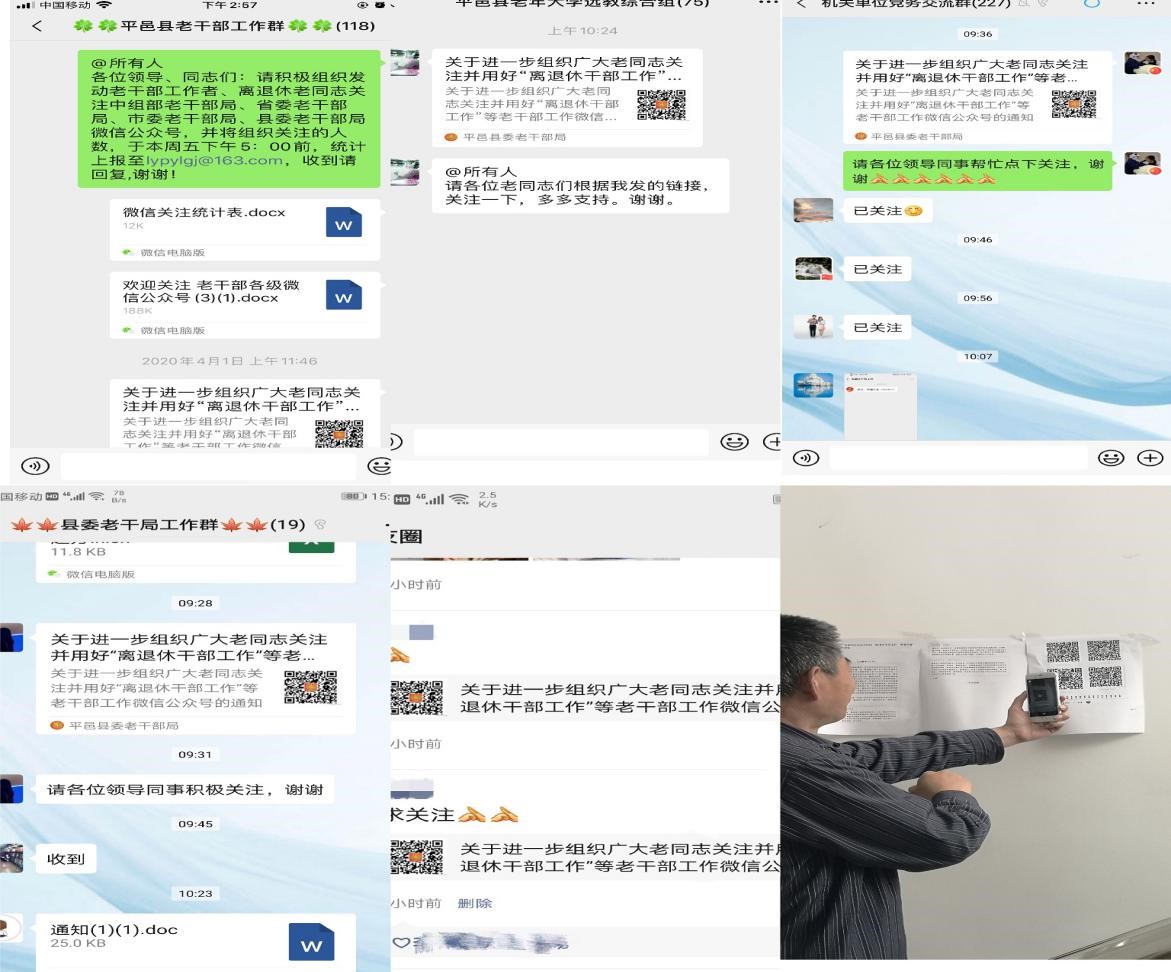 为深入推进平邑县老干部工作信息化建设,进一步发挥好老干部微信公众号的优势作用,宣传老干部工作,展示老干部风采,平邑县通过“两注重一提升”,加强微信公众号关注使用率,组织老干部学好用好微信公众号,做到老干部服务、学习零距离。 注重宣传,营造氛围 通过协同办公平台、微信公众号、老干部工作微信群、老年大学交流群及时发送《关于进一步组织广大老同志关注并用好“离退休干部工作”等老干部工作微信公众号的通知》积极引导广大离退休干部关注微信公众号。同时,在办公场所、家属院张贴公众号二维码,方便老干部扫码关注。鼓励广大干部职工带动家属、朋友关注公众号,进一步扩大“中国老干部”“山东老干部”“沂蒙老干部”“平邑老干部”微信公众号的覆盖面和影响力,不断提升新时代老干部工作的质量和水平。 注重结合,统筹推进