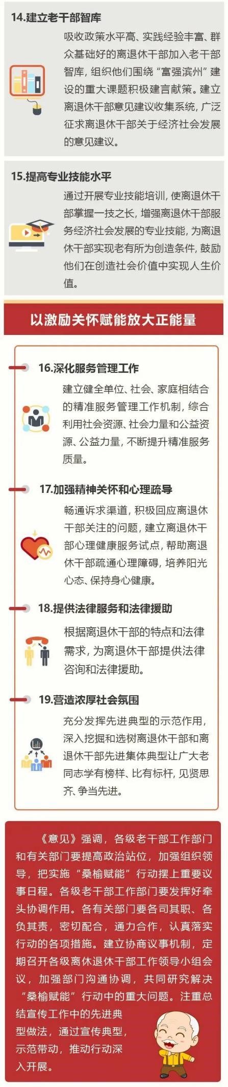 近年来,全省老干部工作部门围绕新时代现代化强省建设,出台制定了一系列务实管用的制度规定,组织引领全省广大离退休干部开展形式多样的活动,为党和人民的事业增添正能量。近日,滨州市出台《意见》,实施“桑榆赋能”行动,为离退休干部发挥正能量注入新动能。现将有关情况予以转发,供各级各部门学习交流。