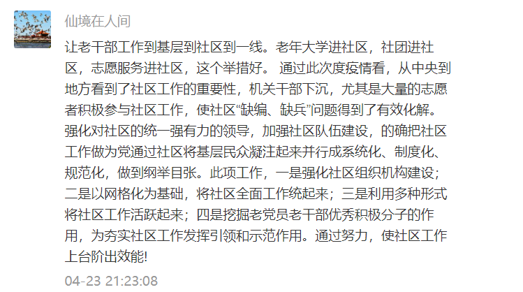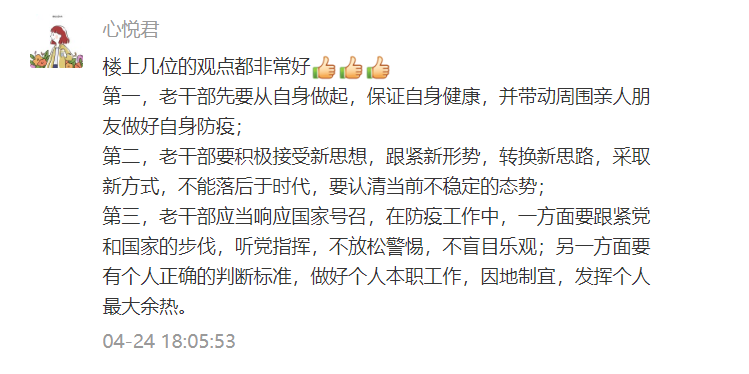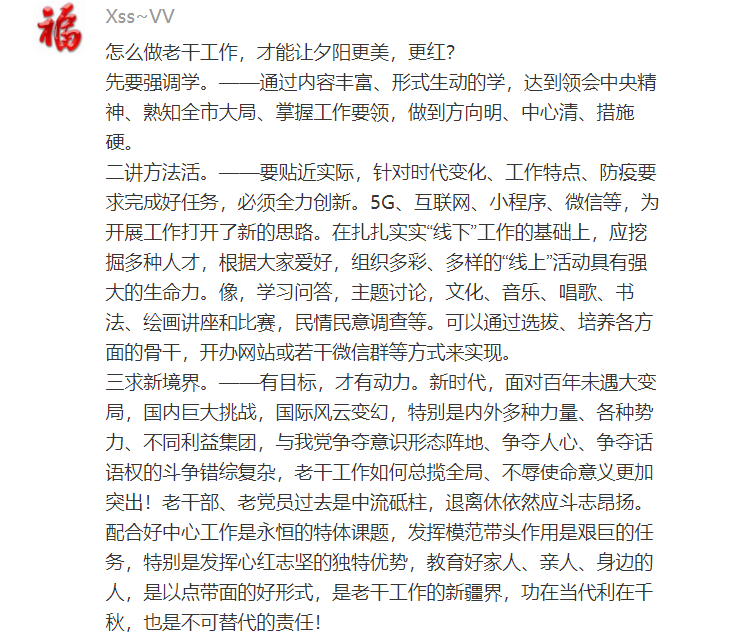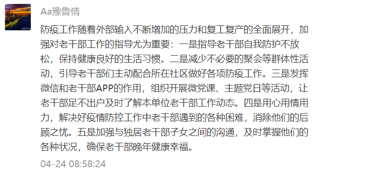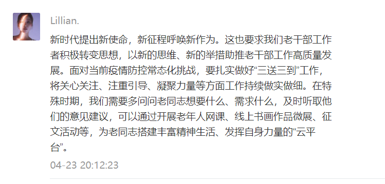 随着疫情防控进入常态化,一些传统的老干部工作方法不能满足当前形势的需求,烟台市委老干部局“不等不靠”,积极“求变”,在全市开展了“金点子·大家谈”活动,引导老干部工作者打破惯性思维,为走出传统路径依赖,因地制宜、因时制宜、因事制宜做好老干部工作出谋划策。 活动通过在《烟台老干部工作信息》开设专栏和在微信公众号留言等方式进行,其中在公众号精选留言点赞前十位的留言者,可获赠精美图书。微信留言活动得到广大离退休干部和老干部工作者的大力支持,活动文章浏览量达到2231人次,收到留言100余条。据悉,烟台市委老干部局正在抓紧梳理收集到的金点子,下一步将研究制定有针对性的措施办法,使“金点子“真正成为科学应对疫情防控常态化、助力老干部工作转型发展的“金钥匙"。 精选留言 下一步,历下区委老干部局将进一步落实好“双报到”工作,继续支持参与社区防疫值守、社区建设、“微心愿”认领等工作,不断为社区群众办实事做好事解难事。 |