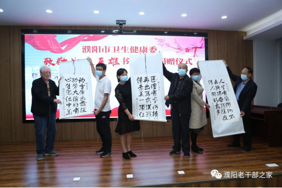 在劳动节来临之际,华龙区重华社区离退休党支部书记李爱民、副书记崔华增、书法家姜爱国、王石刚等人参加濮阳市卫健委的“致敬战疫英雄”书法作品捐赠仪式,支部书记李爱民同志作为发言代表向抗疫英雄致辞感谢。 首先组织一批濮阳知名书法家书写了多幅书法作品,选择最好的装裱师进行了装裱,还特别邀请几位知名书法家为大家现场挥毫泼墨献艺。仪式上重华社区离退休支部代表及各位书法家分别向市中医院等6家医院单位以及市援鄂医疗队共计36名个人英模捐赠书法作品。 这次捐赠活动进一步彰显了离退休老党员的坚强党性,他们虽然退休在家,但老党员们仍然铭记入党的初心,不忘发挥党员的先锋模范作用,以实际行动支持疫情工作。 |