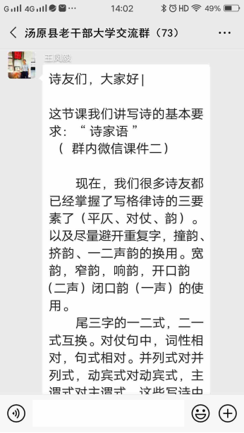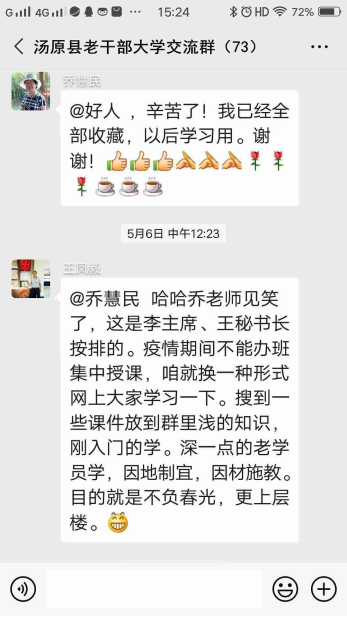按照《2020年全市离退休干部“银发初心助发展”主题活动实施方案》要求,汤原县委老干部局依托县老干部大学学习阵地,探索“微信群+”授课新模式创建“初心学堂”,并根据学员情况,对教学工作进行了安排部署。 5月11日,汤原县老干部大学诗词班正式开课,开课前老师带领学员们开展“课前十分钟”原文朗读活动,认真学习习近平新时代中国特色社会主义思想第一讲,引导学员们坚定理想信念、筑牢思想根基,并针对诗词写作的基本要求进行具体讲解。通过“微信群+”线上教学,让老年学员紧跟时代步伐,享受到了“互联网+”带来的便利,解决了不能集中活动,不能开展学习的问题,受到学员们的一致好评。 学员们纷纷表示,“感谢老师们进行线上教学,老师们的课件语言简练,形式易学易懂,我们学员们都乐于学习,在家学习也很开心。”
