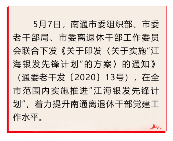 江苏南通市实施“江海银发先锋计划” 着力提升离退休干部党建工作水平