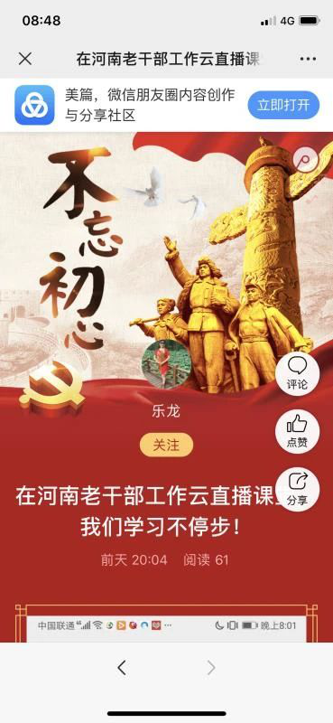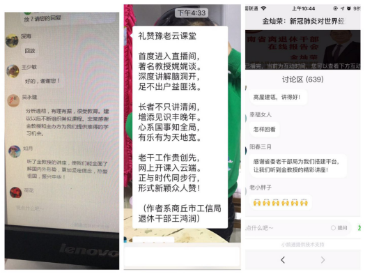 为认真学习贯彻在新冠肺炎疫情防控常态化特殊背景下召开的全国“两会”精神,切实把思想和行动统一到中央决策部署上来,5月27日上午,省委老干部局以网络直播的形式举办首场全省离退休干部线上学习报告会,邀请中国人民大学国际关系学院金灿荣教授与老同志们相约“云端”,以《新冠肺炎对世界经济和国际格局的影响》为题,在“河南老干部”微信公众号云课堂作专题报告,帮助老同志们进一步认清当前疫情防控和经济社会发展形势,加深对党和国家打赢疫情防控阻击战和经济社会发展战略的理解,引导老同志们准确把握大势、精准发挥作用,为河南高质量发展赋能助力。 金灿荣教授从瘟疫与人类历史讲起,通过中外对比,以详实的资料和数据,为我们全面系统地梳理了中国疫情防控取得的重大战略成果,剖析了新冠疫情对世界经济和国际政治的深刻影响,解读了我国今后的宏观经济形势和经济发展战略。 “豫老云课堂”要正式开课的消息早早成为广大老同志关注的焦点:有的老同志提前置顶“河南老干部”微信公众号,定好直播闹钟;有的老同志在老干部工作者的帮助下调试好直播平台,做好收看准备;有的离退休干部党支部组织集中收看和学习讨论,深化学习效果……整个直播过程“人气爆棚”,老同志们边听、边看、边记、边议,云课堂收看数量持续攀升,截至5月28日,上线点击(包括“回看”)超过10万人次。 直播结束后,评论区成为“第二课堂”,老同志们难以抑制激动的心情,写感言、谈体会、抒豪情。大家一致认为,这场报告政治站位高、国际视野广,观点鲜明、内容丰富,说理充分、分析透彻,有助于认清国内国际大局形势,有助于深入理解党和国家的各项决策部署,有助于进一步增强道路自信、理论自信、制度自信和文化自信。 省体育局退休干部张富贵讲到 “这场疫情揭示了一个颠扑不破的真理:有了党的正确领导,全民有了空前的凝聚力,才能早日控制疫情,这是世界上其他国家所无法比拟的。只有中国共产党,只有社会主义才能救民于水火之中!我爱党!我爱中国!” 新乡市老干部李佳旋感慨 “作为一个占世界人口五分之一的泱泱大国,我们有大国的担当,有大国的作为!为我是中国人感到无比的自豪和骄傲!” 漯河市老干部刘俊德写到 “为党中央英明决策和中国抗疫成绩而自豪!” 焦作市王予平老同志留言 “对祖国复兴大业更坚定了信心!” …… 老同志们纷纷表示,当前正处在统筹推进疫情防控常态化和经济社会发展的关键时期,一方面要带头做好科学自我防护,积极倡导文明健康、绿色环保的生活方式;另一方面要坚决贯彻中央、省委的决策部署,坚定“不忘初心、牢记使命”的政治自觉,激发爱党爱国、许党许国的责任情怀,主动发挥自身优势,为奋力夺取疫情防控和经济社会发展“双胜利”、谱写新时代中原更加出彩绚丽篇章作出积极贡献。 商丘市退休干部王鸿润赋诗留言 “长者不只讲清闲,增添见识丰晚年。心系国事知全局,有乐有为天地宽。” 兰考县老同志们表示 “要进一步学习“两会”精神,争做学习宣传贯彻“两会”精神的模范带头人,继续为决战决胜全面建成小康社会贡献自己的力量。” “网络云课堂”“线上报告会”是省委老干部局加强离退休干部思想政治建设的创新之举,也赢得各方点赞好评: “在河南老干部云直播课堂,我们学习不停步” “灵活的云课堂学习,拓展了离退休干部党建工作新模式” “感谢省委老干部局为我们搭建信息化平台,让我们听到这么精彩的讲座,为我们提供难得的学习机会” “现在手机上就能听到这么精彩的报告,太方便了,点赞” …… 近年来,省委老干部局采取多种形式、创新方法手段,着力加强离退休干部政治建设、思想建设、党组织建设。省委老干部局将紧跟时代发展步伐,借助信息化技术手段,以“豫老云课堂”等创新载体,不定期邀请国内知名专家讲授习近平新时代中国特色社会主义思想、解读党和国家大政方针、分析经济社会发展形势……让老同志第一时间学到最新理论知识,足不出户、指尖轻点就能听到高水平、高质量的报告课程。 |