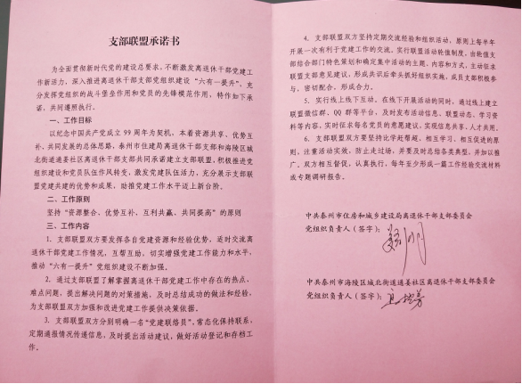 今年来,泰州市积极创新老干部党建工作的新途径,本着资源共享、优势互补、共同发展的思路,探索建立离退休干部“支部联盟”,不断提升离退休干部党建工作的水平。 市委老干部局在前期组织深入调研和学习交流的基础上,由市住建局老干部党支部和海陵区通姜社区老干部党支部建立“支部联盟”。通姜社区老干部党支部是我市离退休干部党建工作的“领头羊”,中组部老干部局、省委老干部局等领导以及省级媒体多次采访报道,通过开展“支部结盟”,示范带动、共享共建,助推老干部党支部“六有一提升”工作迈上新台阶。 “支部结盟”内容包括:一是联盟双方发挥各自党建资源和经验优势,互帮互助,增强做好老干部党建工作的能力水平,推动“六有一提升”党组织建设不断加强;二是通过支部结盟,深入掌握离退休干部党建工作中的热点难点,研究解决问题的对策措施,及时总结成功的做法经验,促进联盟双方加强和改进党建工作;三是支部联盟双方分别明确一名“支部联盟”联络员,常态化保持联系,定期通报情况传递信息,及时提出活动建议;四是联盟双方每半年开展一次党建交流,实行联盟活动轮值制度,由轮值支部结合部门特色策划和确定集中活动的主题、内容和方式,密切配合,形成合力;五是实行线上线下互动,建立支部联盟微信群,及时发布联盟动态、活动信息、学习资料等,实现信息共享、人才共用;六是坚持比学赶超、相互学习,注重实效,及时总结各类典型,并加以宣传推广,每年至少形成一篇工作经验交流材料或专题调研报告。 离退休干部“支部联盟”的建立,搭建了老干部党支部之间学习交流的平台、共建共享的平台、争先创优的平台,下一步泰州市将继续扩大“支部联盟”的范围和影响力,为促进全市离退休干部党支部100%通过省达标验收、100%创成“三星级”以上支部提供智慧和力量。 |