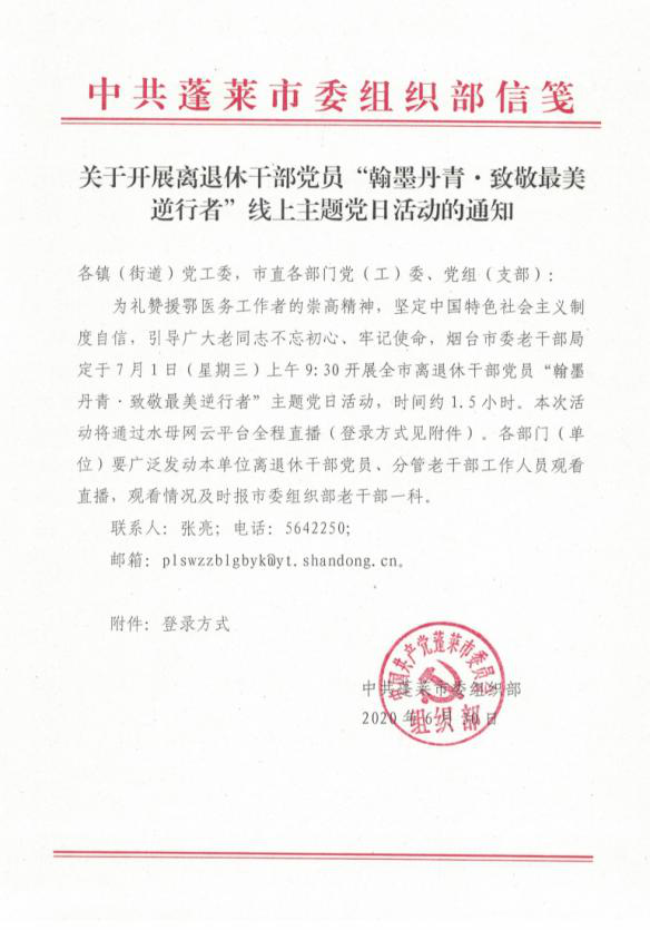近日,蓬莱市精心部署周密安排,组织广大老同志收看烟台市委老干部局开展的离退休干部党员“翰墨丹青·致敬最美逆行者”主题党日活动。 多个层面齐发动 收到烟台市局通知后,蓬莱市高度重视,市委组织部分管副部长要求,多个层面协作配合,抓好组织发动等前置工作。