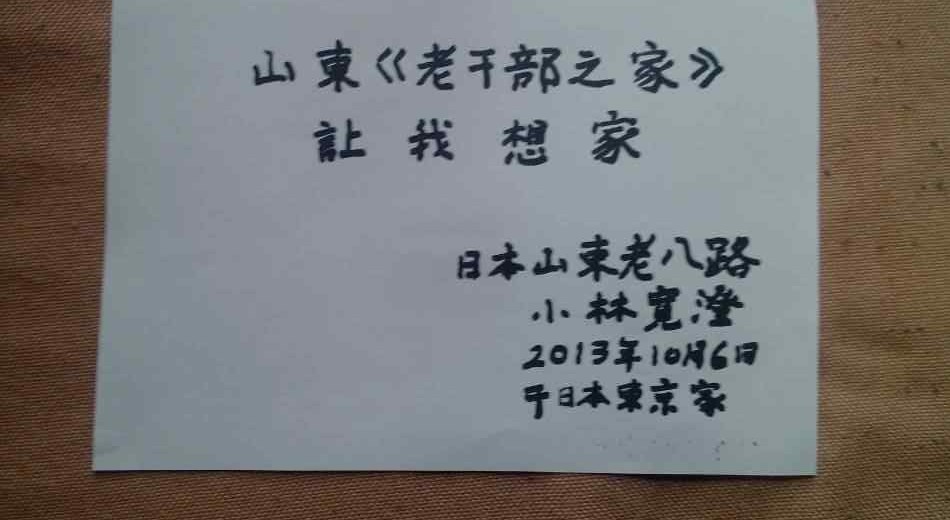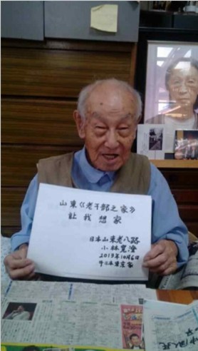 近日,“日本八路军新四军战友会会长”“前在华日人反战同盟山东地区协议会执行委员 鲁中支部 滨海支部长”——93岁的小林宽澄,在日本家中写下了“山东《老干部之家》让我想家”的话语,托旅日“家”人梁金丽老师带回给《家》刊。 小林宽澄原是侵华日军机枪手,被俘觉醒后加人了八路军,从此走上了反战反侵略之路。2010年5月,时任国家总理温家宝总理访日,专门设宴邀请了小林宽澄等反战同盟老战士。2010年6月,小林宽澄到山东看望老战友、寻找当年掩护过他的恩人,《家》刊协助并对小林宽澄一行进行了采访。得知山东省委老干部局修建了山东老战士纪念广场以后,在《家》刊记者的陪同下,小林宽澄参观了纪念广场,并郑重地提交了纪念广场刻名申请表。 查看《家》刊采访文章:《91岁日本老八路的中国战友情》请点击链接: |