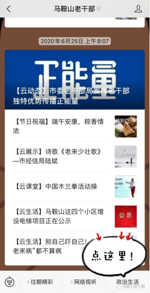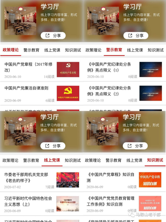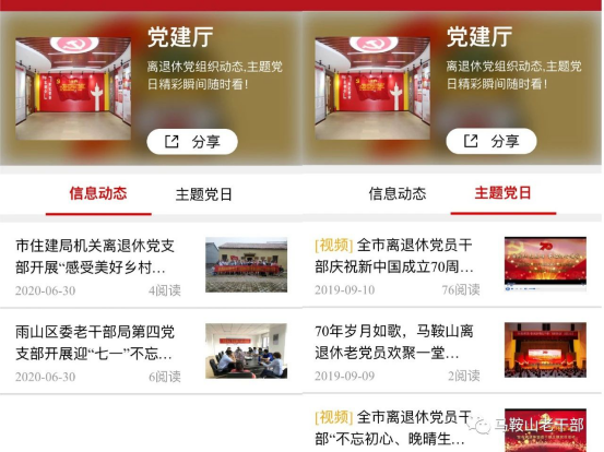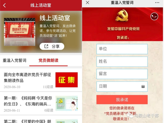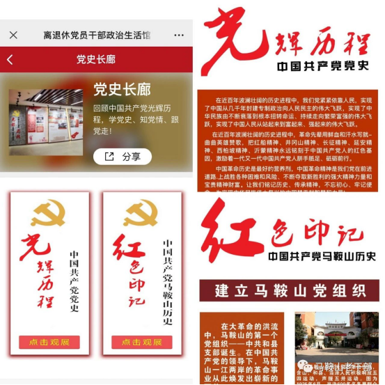 上线了!上线了! 在中国共产党建党99周年之际 安徽马鞍山市“银耀诗城”线上离退休党员干部政治生活馆 正式开馆啦! “银耀诗城”线上离退休党员干部政治生活馆,是今年市委老干部局结合实际,发挥“互联网+老干部”工作优势,变“面对面”交流为“屏对屏”沟通,改“线下集聚”为“网端互动”,构建离退休党员干部“云党建”的创新之举,也是全省首家离退休党员干部开放式党性教育“云课堂”! 快来打卡线上政治生活馆, 开启“初心之旅”, 踏上“使命之途”! 入馆必备: 智能手机1部+关注“马鞍山老干部”服务号 生活馆入口: 点击“马鞍山老干部”服务号底部菜单栏“政治生活” 馆内布局: 线上政治生活馆设置“一廊两室三厅”,即:党史长廊,线上活动室、微电影室,党建厅、学习厅、银发风采厅。 党史长廊 回顾中国共产党党史和马鞍山党史,学党史、知党情、跟党走。 线上活动室 组织开展线上党建活动,快来参与近期活动——重温入党誓词,写下你的微承诺,我们将会更新在“党员晒承诺”中哦! 微电影室 播放经典红色电影,回忆峥嵘岁月,传承红色基因。 党建厅 宣传各级离退休党组织党建信息动态等。 学习厅 包含政策理论、警示教育、线上党课、知识测试等学习内容。 银发风采厅 展示我市离退休干部先进事迹,发挥先进典型示范引领作用。最新上线的宣传片《抗疫老将》也可以在这里观看哦! 用好线上政治生活馆 不忘初心、锤炼党性 树牢“四个意识”、坚定“四个自信”、做到“两个维护” 为党和人民的事业增添正能量! |