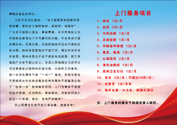 乐陵市离休干部“医养一体”精准服务手册 在中国共产党成立99周年之际,为体现党内关怀,进一步做好离休干部“一对一”精准服务工作,德州乐陵市在全市离休干部中启动了“医养一体”精准服务项目。为离休干部提供上门体检、心理疏导、理发剃须、指甲修剪、泡脚按摩、卫生清扫、衣物清洗、家电维修等服务,并为每位离休干部配备了智能手环……今后,乐陵市全市离休干部足不出户就会定期收到为他们量身定制的暖心服务“大礼包”。 随着离休干部进入“后双高期”,他们在医疗保健、居家服务、心理慰藉等多方面的个性化、深层次要求越来越迫切。为此,乐陵市委老干部局尝试在服务形式上引入市场化、专业化的社会服务资源,探索通过政府购买服务,社会组织实施,为离休干部提供更加精准精细的医养服务,不断提高服务质量和水平,提升离休干部幸福指数和满意度。 服务项目涵盖医疗保健、生活照料、居家服务等十多项服务内容,每月上门为离休干部服务。同时,建立服务管理综合信息平台,为老干部人人配备智能手环,链接“医家通养老云”网络平台,提供“互联网+实体援助”多层次医养服务。离休干部使用智能手环通过网络平台可以实现呼叫服务、联系家人、紧急救援等服务,老干部局也可以通过网络平台在线监督,及时掌握服务机构提供服务情况和反馈意见。 离休干部纷纷表示,在建党99周年之际收到这样暖心的“礼包”,使我们深切感受到党组织的温暖,感受到乐陵市委、市政府的关心和照顾,乐陵市委老干部局不断创新、主动作为,这个“娘家人”比子女做的更贴心、更暖心! |
