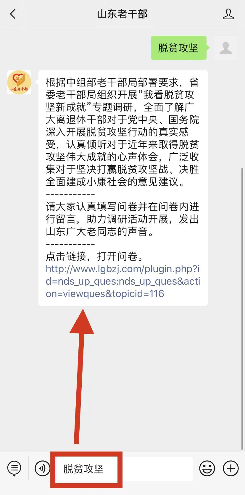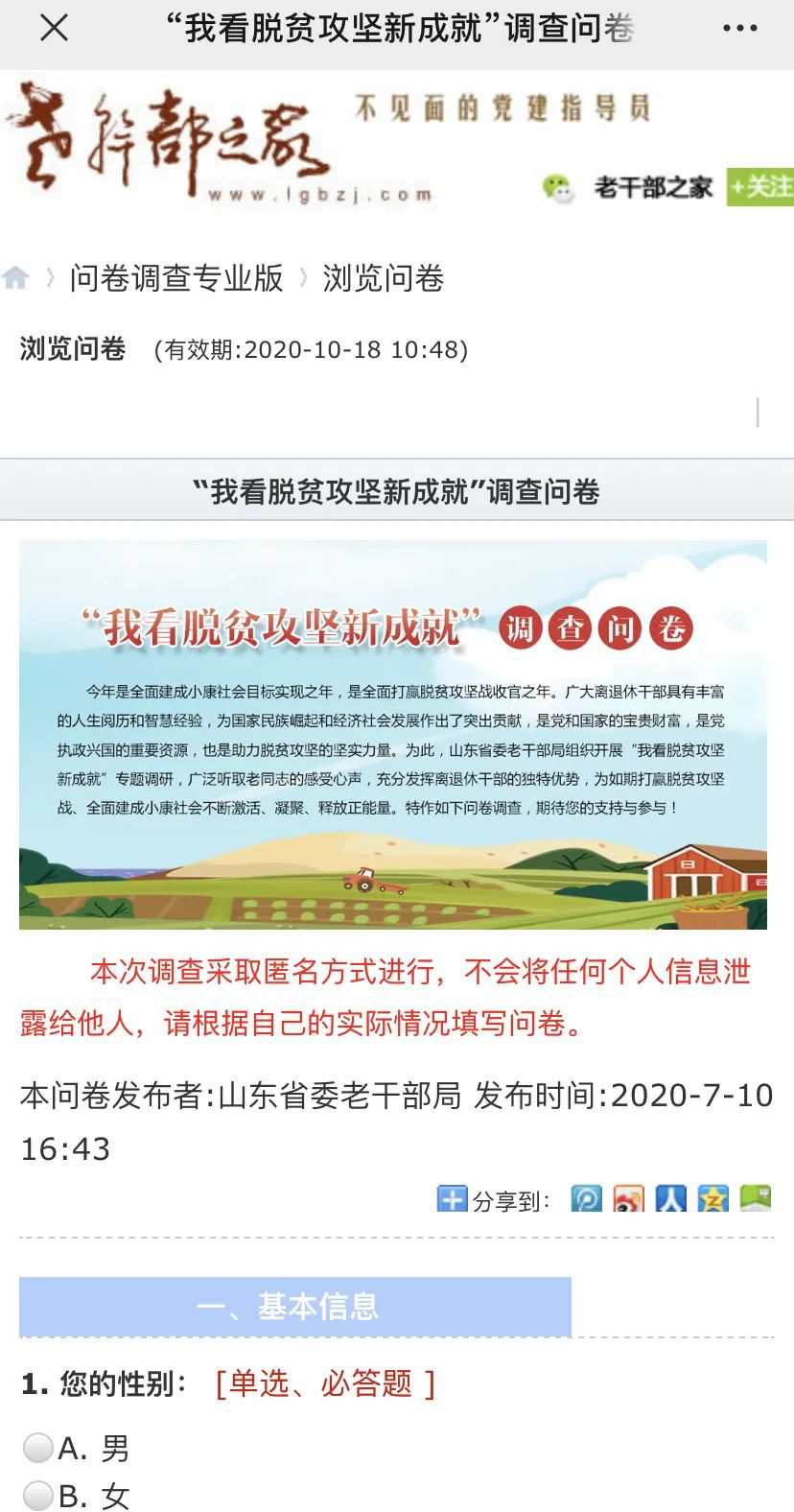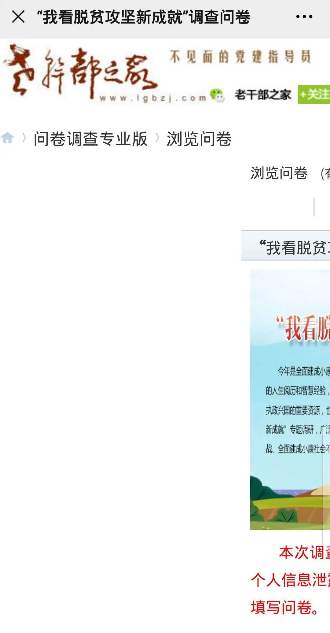 今年是全面建成小康社会目标实现之年,是全面打赢脱贫攻坚战收官之年。广大离退休干部具有丰富的人生阅历和智慧经验,为国家民族崛起和经济社会发展作出了突出贡献,是党和国家的宝贵财富,是党执政兴国的重要资源,也是助力脱贫攻坚的坚实力量。 根据中组部老干部局要求,山东省委老干部局于日前正式启动“我看脱贫攻坚新成就”专题调研,广泛听取老同志对于党中央、国务院深入开展脱贫攻坚行动、取得伟大成就的心声感受,广泛收集老同志意见建议,依托老干部之家网、“山东老干部”微信公众号开辟了“我看脱贫攻坚新成就”专栏,并附调查问卷。各级老干部工作部门要积极组织本地离退休干部填写问卷并进行留言,助力调研活动开展,发出山东广大老同志的声音。 下附活动参与方式: ✔电脑端: 搜索进入老干部之家网官方网站,点击“我看脱贫攻坚新成就”板块即可参与填写调查问卷。 ✔手机端: 1、打开“山东老干部”微信公众号,点击左下角“调查问卷”进行填写。 2、打开“山东老干部”微信公众号,发送关键词“调查问卷”或者“脱贫攻坚”得到自动回复,点击链接即可填写调查问卷。 3、调查问卷填写页面如图①所示,若打开链接后出现图②所示的情况,可以点击右上角三个小点,选择在浏览器中打开,即可进行问卷填写。 图①↓ |
