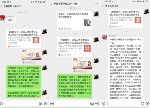 为深入学习贯彻习近平总书记重要讲话精神,保障老年人合法权益,提高运用《民法典》维护权益、化解矛盾纠纷、促进社会和谐稳定的能力和水平,德州乐陵市委老干部局多渠道广泛宣传,并组织《民法典》专题学习活动。 网上广宣传 通过全市老干部工作微信群、老年大学微信群、老干部社团微信群等广泛发动离退休干部观看《学好用好民法典》专题报告会,并收集老干部感想体会。 组织集中学 9月7日下午,组织离退休干部代表和全局干部集中收看《学好用好民法典》网上专题报告会。 普法进社区 9月7日上午,市委老干部局全体人员在共助共建社区——渤海家园开展普法宣传,向居民发放宣传页,重点向老年人介绍、解读与居民权益息息相关的《业主的建筑物区分所有权》章节。 畅所欲言 通过《民法典》专题学习,老干部们纷纷表示,会带头宣传、推进、保障民法典实施,做学习、遵守、维护民法典的表率。 乐陵市秋实老干部文学协会会长杨源水:《中华人民共和国民法典》是一部以人民为中心、与每个人的生活工作休戚相关的法典。它,是事关每一位中国公民,从胎儿到身故后五十年,切身利益保障的法律。《民法典》的颁布实施,必将成为中国特色社会主义,法律体系“大厦”的重要支柱,必将成为实现“两个一百年”的奋斗目标,提供坚实的法治保障。 我作为秋实老干部文学协会的会长,一定要带领全体会员,先学一步、悟懂内涵。通过撰写专题文稿、编印专题文集、组织志愿者演讲等途径,为《民法典》在乐陵市的宣传、普及做贡献。 乐陵市退休干部陈西山:一部《民法典》,植根于中华文化的沃土,诞生于全面建成小康社会的前夜,是十四亿中国人民的行动规范,是社会主义核心价值观的全面体现。全典7编84章1260个条文,涉及个人单位家庭社会的方方面面 ; 涵盖生老病死,衣食住行,借贷往还,婚丧嫁娶。大到国家民族,小到鸡毛蒜皮,无一不包,无微不至,无所不及,在家里或在社会上遇到的所有问题和困惑,几乎都能在这部法典里找到答案,找到规则,找到规范。 如果说《宪法》是实现国家治理现代化的总纲,《民法典》就是实现国家治理现代化的全目。遵循这部法典,家庭必将更加温馨,邻里必将更加和睦,社会必将更加和谐,人民必将更加团结,国家必将更加文明,民族必将更加强盛。作为一名退休干部,有义务学习宣传好这部法典。首先从自身做起,从自己的家庭做起,带头学法遵法守法,还要影响亲戚朋友邻里庄乡,依法树立自己的道德操守,建立自己的行为规范。 乐陵市退休干部邓贵振:国有国法,家有家规。社会的和谐稳定,公平正义,人民的生活幸福都要靠法律来保障。随着时代的发展,社会的进步,人民生活越来越好,涉及到日常生活方方面面的法律问题也越来越复杂。《民法典》的诞生,就像一个无形的天网,全方位地保护人民群众的民事权利。开启了我国公民权利保护的崭新时代,它体现了人民的需求,保障人民的权益,标志着我国法律体系的进一步完善,标志着我国依法治国迈上了一个新台阶。 《民法典》是满足人民对美好生活新期待的必备法典,一定要学习好,实施好。作为一名退休人员,要模范带头,以身作则,要把学习《民法典》当做日常生活的头等大事。学习好,领会好,宣传好,遵守好,维护好。让更多的人熟知、掌握,以便更好地保护好自己的自身权益不受侵害,为促进社会的和谐稳定做出自己的贡献。 乐陵市退休干部田伟岭:5月28日由全国人大高票通过的建国以来第一部“法典”命名的《民法典》,关系到人们的生产、生活和社会行为的方方面面。衣食住行、婚姻家庭、民间借贷等等无所不及。是建设社会主义法制社会的根本保证,也是和谐社会发展的行为规范。学法、懂法,用法,守法更是每一个社会公民的义务和责任。我对《中华人民共和国民法典》的颁布和实施深表赞同,可谓是: 盛世和谐修法典, 行为守则定方圆。 堪称建国第一部, 关注民生释意全。 律制安邦古今在, 公平正义育忠贤。 人民幸福家家乐, 华夏文明万万年。 乐陵市退休干部张桂红:翻开历史的画卷,从1954年到2017年民法典走过了漫长的道路,一部“法”的诞生伴随着中国社会60多年跌宕起伏的发展,伴随着在中国共产党的领导下中国人民“从站起来、富起来到强起来的历史飞跃”,与人民生活息息相关,以“人民至上”绝不动摇,为“人民幸福”保驾护航。从生活的鸡毛蒜皮到人生终身大事,更新服务零距离。从生活中的充值、“霸座”到结婚登记、夫妻债务等,从细节中为人民群众的“钱袋子”“米袋子”保驾护航,为人民群众打开幸福之门提供有力保障。 编纂民法典是坚持和完善中国特色社会主义制度的现实需要;是推进全面依法治国、推进国家治理体系和治理能力现代化的重大举措;是坚持和完善社会主义基本经济制度、推动经济高质量发展的客观要求。就如一块千锤百炼,无比坚固的“磐石”,铺就在“复兴号”列车带领人民驶向更加幸福的道路上! |