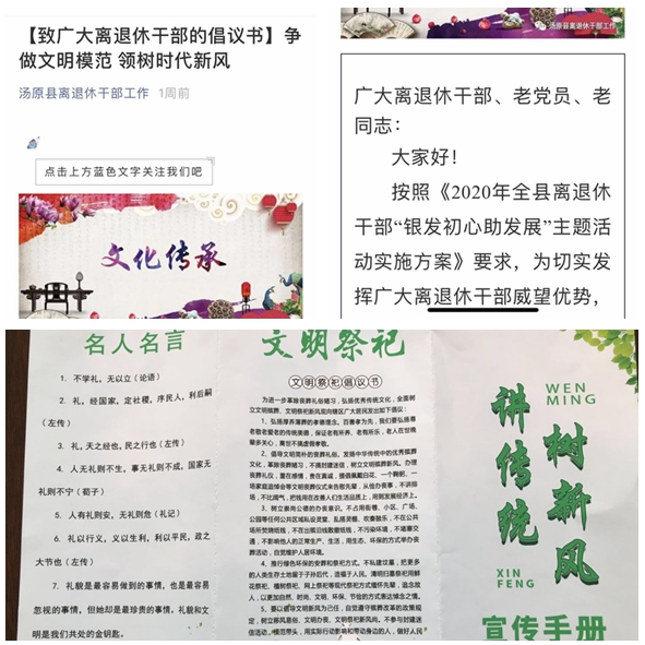 为认真贯彻落实《2020年全市离退休干部“银发初心助发展”主题活动实施方案》,充分发挥广大离退休干部的政治优势、经验优势和威望优势,不断深化拓展正能量系列活动,近日,黑龙江佳木斯汤原县委老干部局组织老干部志愿服务团队开展“讲传统树新风”宣传活动。 为确保宣传活动效果,汤原县委老干部局通过微信公众号向全县离退休干部发出《争做文明模范 领树时代新风》倡议书,大家纷纷通过微信工作群、朋友圈积极转发倡议书,号召老同志带头践行,在心中种下讲传统树新风的“种子”,弘扬了社会正能量。 活动现场,老干部志愿者兼职社区网格员纷纷到县9个社区积极向居民群众发放“讲传统树新风”宣传手册,宣传使用“公筷公勺”的益处,以及要养成勤洗手、勤通风、戴口罩、适度锻炼等良好生活习惯,老干部志愿者下沉社区、融入网格,积极做和谐社区的服务者和维护者,获得社区居民一致好评,取得良好效果。 此次“讲传统、树新风”宣传活动,共悬挂条幅9个,发放宣传手册100余份,充分发挥了老干部志愿者的模范带头作用,同时调动了广大群众的积极性和主动性,树立强烈的文明“主人翁”意识,形成讲道理、讲文明、讲科学的良好风尚。社区居民纷纷表示,要在今后工作和生活中,从我做起、从身边做起、从眼前做起,积极倡树文明健康生活理念,做身体力行的践行者,做时代新风的引领者。 |
