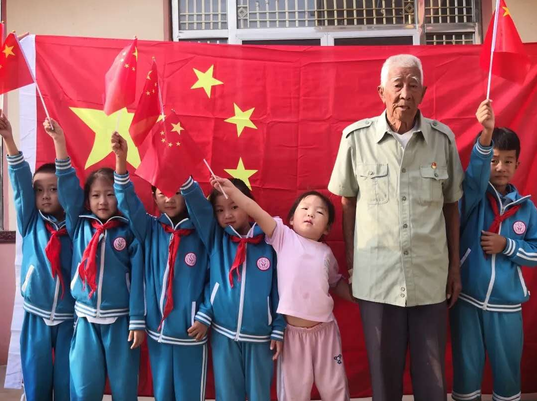 为进一步深入学习贯彻习近平新时代中国特色社会主义思想,庆祝中华人民共和国成立71周年,推进社会主义核心价值观建设,推动“传承红色基因”工作的深入开展,近日,青岛胶州市关工委在全市开展了“与国旗合个影 为祖国献祝福 与胶州共发展”主题活动。图为胶州市胶西街道的梁茂祥老人,一位建国前老党员、抗美援朝的老兵,曾经用青春和生命捍卫过国旗的尊严。今天,他将一段段往事讲给孩子们听,让爱国的种子深深扎根在孩子们心中。