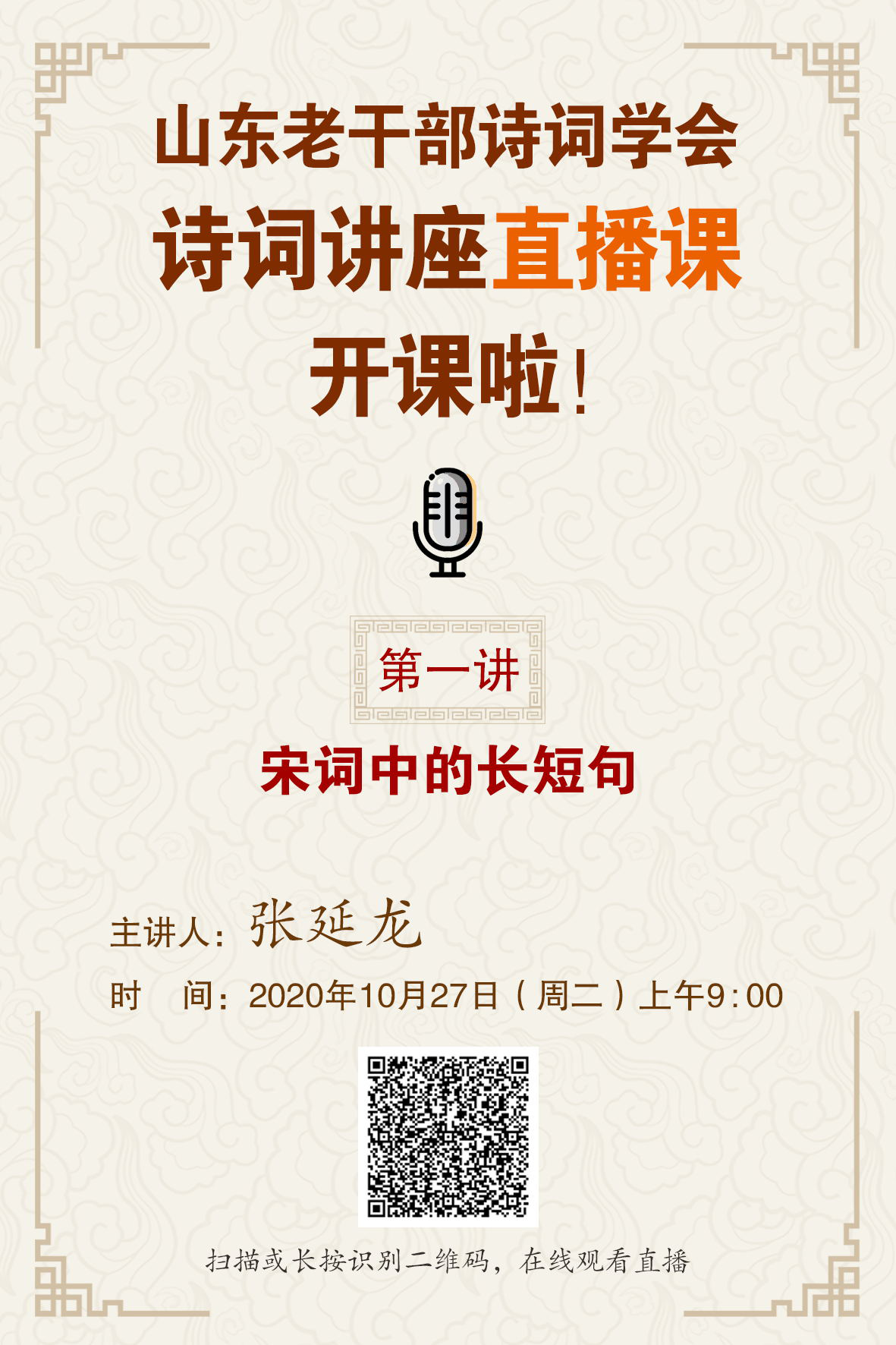 话金秋、庆重阳,10月27日上午,山东老干部诗词学会在《老干部之家》杂志社多功能厅举办诗词讲座,本次讲座采用线下讲座+线上直播的形式,为严格执行疫情防控要求,线下讲座控制在30人,同时有千余人次线上观看直播课程,大家对讲座内容和双线直播的形式表示赞赏。 本次讲座主讲人为山东老干部诗词学会名誉会长、《诗坛》原总编张延龙。张延龙老师以“宋词中的长短句”为主题,从宋词的各种句式出发,深入浅出地为诗友们讲述了宋词长短句的灵活运用、长短句应用对词牌声律美的影响等,深受广大诗友欢迎和好评。 讲座结束后,到会诗友还分享自己的学习心得,并以朗诵的形式分享了即时创作的诗词作品。讲座在全场合唱《歌唱祖国》中圆满落下帷幕。 线上直播课打破了地域和时间的限制,扫码进入直播间,听课方便快捷,弥补了因事未能到场或外地诗友的遗憾,直播课结束后大家在群中纷纷点赞。 直播课程支持回播观看,未能观看直播的诗友、老师可扫描下方二维码看精彩回放! |