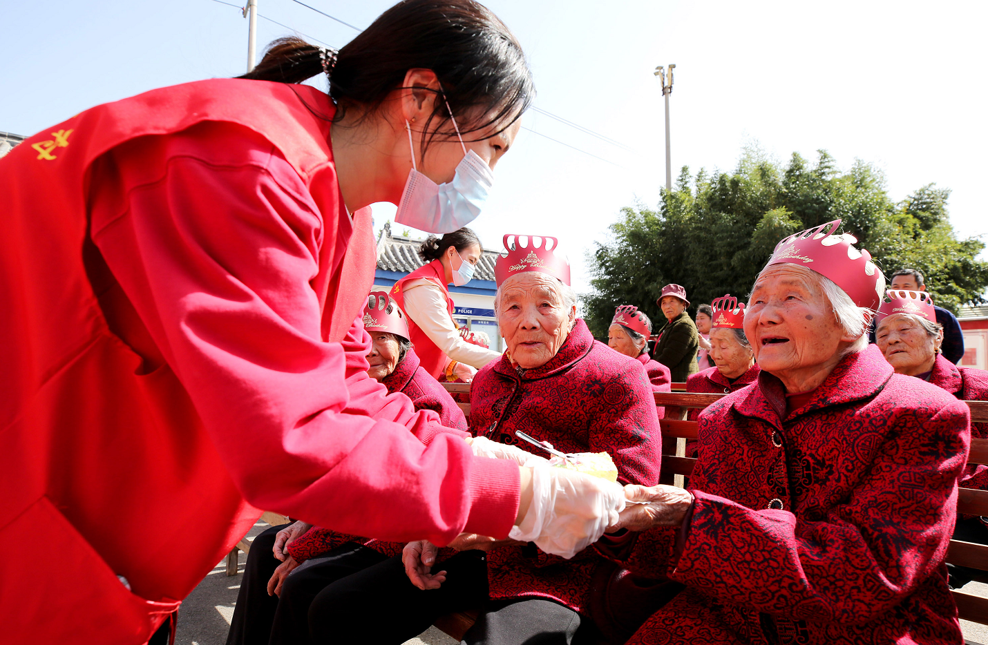 当日,山东省枣庄市市中区孟庄镇大郭庄村新时代文明实践志愿者服务队为村里52名年满80岁以上的老年人举办“爱在金秋 喜迎重阳”集体生日会活动。志愿者为老年人购买了生日蛋糕、服装、表演了文艺节目等,弘扬尊老、敬老、爱老的传统美德,在欢乐祥和的气氛中喜迎重阳节的到来。 (图1)10月22日,在山东省枣庄市市中区孟庄镇大郭庄村,志愿者在为老年人试穿购买的新衣服。 (图2)10月22日,在山东省枣庄市市中区孟庄镇大郭庄村,志愿者在为老年人分切生日蛋糕。 (图3)10月22日,在山东省枣庄市市中区孟庄镇大郭庄村,志愿者把分切的生日蛋糕送到老年人的手中。 (图4)10月22日,山东省枣庄市市中区孟庄镇大郭庄村新时代文明实践志愿者服务队在为老年人表演文艺节目。 (图5)10月22日,山东省枣庄市市中区孟庄镇大郭庄村92岁的抗战老兵郑玉合在对参加此次活动的志愿者讲述革命故事。郑玉合老人先后有3位亲人在抗美援朝战场和抗日战争、解放战争中牺牲。 |