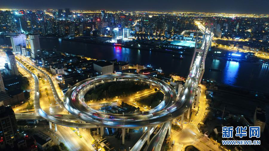 这是上海南浦大桥夜景(2017年4月13日摄,无人机照片)。新华社记者 丁汀 摄