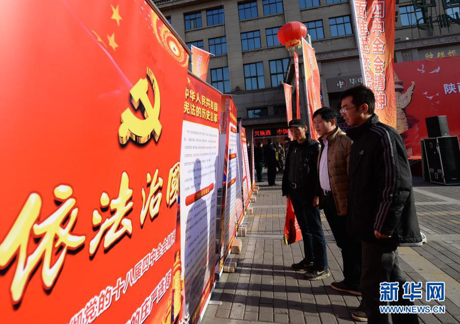 西安市民在国家宪法日宣传活动现场观看依法治国宣传展板(2014年12月4日摄)。新华社记者 李一博 摄