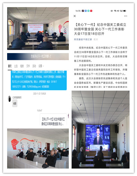 11月17-18日,纪念中国关心下一代工作委员会成立30周年暨全国关心下一代工作表彰大会在北京召开,习近平总书记就关心下一代工作作出重要指示。连日来,甘肃酒泉市阿克塞县各级关工委采取线上+线下、集体学、自主学、谈感受等多种学习形式,迅速掀起了学习贯彻习近平总书记重要指示精神的热潮。 阿克塞县关工委:初心不改担使命 砥砺前行再出发 阿克塞县高度重视、高位推动,认真组织全县广大“五老”和老干部、关工委工作者收看学习、深刻领悟精神实质,自觉把思想和行动统一到习近平总书记重要指示精神上,把智慧和力量凝聚到实现大会确定的各项任务上来,在思想上政治上行动上同以习近平同志为核心的党中央保持高度一致。 广泛动员,营造氛围 第一时间在“阿克塞老干部之家”公众号和关工委工作群转发会议信息,要求全体老干部和老干部工作者认真学习会议精神。经过上下广泛宣传发动,进一步激发了广大老干部和老干部工作者学习热情,营造了学习贯彻习近平总书记重要指示精神的浓厚氛围。 精心组织,多措并举 阿克塞县关工委结合实际,积极适应疫情防控常态化特点,采取集体学习、个人自学相结合的形式,认真组织广大退休干部和老干部工作者在县老干部活动中心培训室观看了中央电视台新闻联播关于纪念中国关心下一代工作委员会成立30周年暨全国关心下一代工作表彰大会的新闻报道;针对一些老同志行动不便的实际,开展上门“点对点”指导学习服务,力求把重要指示精神送到每位党员身边。 畅谈体会,凝聚力量 学习过程中,老同志们聚心会神、专心听讲。通过各种方式分享学习心得和体会,有的现场发言,有的微信留言。大家纷纷表示,要紧紧团结在以习近平同志为核心的党中央周围,上下一心,同心同德,奋进新时代,开启新征程,牢记初心使命,勇于担当作为,发挥自身的特长和优势,真正做到老有所为、发光发热,为培养合格的社会主义建设者和接班人贡献自己的力量。 县关工委常务副主任杨全春表示,习近平总书记重要指示精神为我们在新时代加强青少年思想道德教育、培育时代新人提供了遵循、指明了方向,激励我们育人更加有方向、有信心、有力量地阔步向前。我们要遵循习近平总书记对关心下一代工作的重要指示,携手“五老”,同心同德,献余热、立新功,开创关爱下一代工作新局面、谱写护花育苗新篇章!县关工委副主任李永忠表示,我作为“五老”人员,要保持奋进者的姿态,发挥余热,服务青少年,对青少年进行“两史三爱”教育和人生观教育,努力在全面建设社会主义现代化新征程中作出更大贡献。退休干部萨乃汗表示,将认真学习习近平总书记所作的重要指示精神,不忘初心、牢记使命,想党政之所想、急大局之所需、送青少年之所盼,为传承时代基因、弘扬时代新风、促进青少年健康茁壮成长作出应有的贡献。 阿勒腾乡关工委:以习近平总书记重要指示统领关工委工作 11月25日,阿勒腾乡关工委组织全乡干部职工及农牧民群众召开了传达学习习近平总书记就做好关心下一代工作重要指示暨全国关工委表彰大会精神的专题会议。 会上,学习了习近平总书记就做好关心下一代工作的重要指示和中国关工委主任顾秀莲在大会上的讲话精神。 会议要求,一要全面理解、深刻领会习近平总书记重要指示精神,高质量做好新时代关心下一代工作;二要加强新时代“五老”队伍建设,建立完善工作保障机制;三要活化教育形式和内容,促进关爱服务体系和关爱服务能力进一步提升。 与会同志一致认为,习近平总书记的重要指示使全乡干部职工深受鼓舞,倍感振奋。全乡干部要在学用结合上再拓展、再深化,以更加饱满的热情投身乡镇建设事业,尽己所能为广大青少年健康成长献上一份力量。 阿克旗乡关工委:学深悟透 重在行动 切实把习近平总书记重要指示精神落实落细 11月23日上午,阿克旗乡关工委召开专题会议深入学习贯彻习近平总书记重要指示和纪念中国关心下一代工作委员会成立30周年暨全国关心下一代工作表彰大会精神,全乡干部职工40余人参加。 会议强调,要深入学习贯彻习近平总书记关于做好关心下一代工作的重要指示批示精神,引导青少年树立和践行社会主义核心价值观,支持和帮助青少年成长成才,团结教育广大青少年听党话跟党走,努力培养德智体美劳全面发展的中国特色社会主义建设者和接班人。 会上,大家一致表示:习近平总书记高度重视关心下一代工作,多次做出重要指示批示,为做好关心下一代工作指明了方向、提供了遵循。我们要从党的事业后继有人、兴旺发达的高度,充分认识做好新时代关心下一代工作的重要意义,进一步增强责任感、使命感、荣誉感,切实把这项固本工程、战略工程、基础工程、铸魂工程抓实抓细。坚持用习近平新时代中国特色社会主义思想教育青少年,帮助青少年牢固树立正确的世界观、人生观、价值观,引导青少年从小学习做人、从小学习立志、从小学习创造,听党话跟党走,做祖国和人民事业发展的接班人。 县小学关工委:学习贯彻习近平总书记重要指示精神 11月26日,县小学关工委根据县关工委通知文件要求,开展了“学习贯彻习近平总书记对关心下一代工作重要指示和纪念中国关工委成立30周年暨全国关心下一代工作表彰大会精神”活动。 各年级班主任