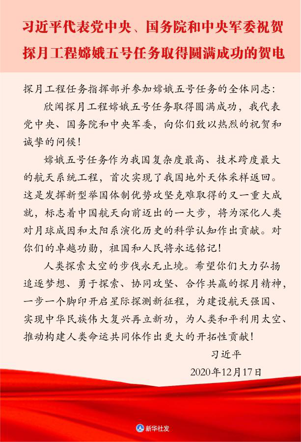 新华社北京12月17日电 12月17日1时59分,嫦娥五号返回器携带月球样品在内蒙古四子王旗预定区域安全着陆,探月工程嫦娥五号任务取得圆满成功。中共中央总书记、国家主席、中央军委主席习近平发来贺电,代表党中央、国务院和中央军委,向探月工程任务指挥部并参加嫦娥五号任务的全体同志致以热烈的祝贺和诚挚的问候。 习近平在贺电中指出,嫦娥五号任务作为我国复杂度最高、技术跨度最大的航天系统工程,首次实现了我国地外天体采样返回。这是发挥新型举国体制优势攻坚克难取得的又一重大成就,标志着中国航天向前迈出的一大步,将为深化人类对月球成因和太阳系演化历史的科学认知作出贡献。对你们的卓越功勋,祖国和人民将永远铭记。 习近平强调,人类探索太空的步伐永无止境。希望你们大力弘扬追逐梦想、勇于探索、协同攻坚、合作共赢的探月精神,一步一个脚印开启星际探测新征程,为建设航天强国、实现中华民族伟大复兴再立新功,为人类和平利用太空、推动构建人类命运共同体作出更大的开拓性贡献。 国务委员王勇在北京航天飞行控制中心嫦娥五号任务飞控现场宣读了习近平的贺电。 嫦娥五号任务实现了我国首次月面采样与封装、月面起飞、月球轨道交会对接、携带样品再入返回等多项重大突破,其成功实施标志着我国探月工程“绕、落、回”三步走规划如期完成。 图表:习近平代表党中央、国务院和中央军委祝贺探月工程嫦娥五号任务取得圆满成功的贺电 新华社发 延伸阅读: 习近平代表党中央、国务院和中央军委祝贺探月工程嫦娥五号任务取得圆满成功的贺电 |