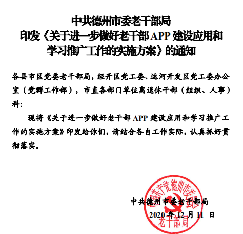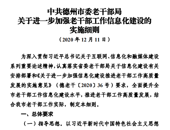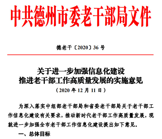 为建立健全老干部工作信息化建设制度机制,加强信息化建设工作规范,提升信息化建设系统性针对性有效性,近日,德州市坚持“总体设计、细化推进和重点突破”相结合,研究印发了以“三个一”(即“一个意见”《关于进一步加强信息化建设推进老干部工作高质量发展的实施意见》;“一个细则”《关于进一步加强老干部工作信息化建设的实施细则》和“一个方案”《关于进一步做好老干部APP建设应用和学习推广工作的实施方案》)为主体的信息化建设制度体系,从不同层面对信息化建设做出了制度安排、搭建了制度框架,以制度建设为抓手,掀开了老干部工作信息化建设新篇章。 三项制度互为表里,各有侧重。其中,《实施意见》总体提出了信息化建设的总体目标、主要任务和总体要求,明确力争用1—2年时间,健全实用有效的老干部工作信息化平台体系,各类信息化平台得到全面应用推广,老干部工作者信息化素质能力大幅提升,信息技术与老干部工作全方位、全过程深度融合,老干部工作实现线上线下全面对接、转型升级。 《实施细则》提出了“坚持政治引领,服务中心大局;坚持多元融合,加强平台建设;坚持开放共享,注重资源整合;坚持科学适度,突出实用实效;坚持安全可靠,强化防护意识”的“五项基本原则”,从“突出加强信息化平台体系建设、切实抓好信息化平台技术应用、注重加强老干部学习教育培训、着力提升老干部工作者信息化工作能力、健全完善网络和信息安全制度机制”5个方面,明确了22项具体任务措施,并就信息化建设组织领导、责任分工、督导考评、建立长效机制等方面做出了明确要求。 《实施方案》重点围绕学习宣传推广老干部APP,针对发挥老干部APP龙头带动作用和集成性、开放性、扩展性功能优势,对加强老干部APP属地化功能建设、扎实做好老干部APP基础维护与应用、注重加强老干部APP平台学习、加大老干部APP宣传推介力度做出了重点安排,并从市县各级党委老干部局、市县各级各部门单位、各级老年大学、关工办、老干部协会组织等不同层面,明确了宣传推广工作组织领导和责任分工。 此前,为确保制度的针对性有效性可操作性,市委老干部局多次召开局长办公会、中层干部研讨会,着力加强老干部工作信息化建设制度体系研究,逐步明确了目标思路和推进措施,并多方征求了意见建议。下一步,德州市将以“三个一”制度落实为重点,进一步提升老干部工作信息化、数字化、智能化应用水平,提升信息化平台融合度、互联度,增强服务精准化、社会化能力,努力为新时代老干部工作高质量发展搭建新平台、赋予新动能。 |