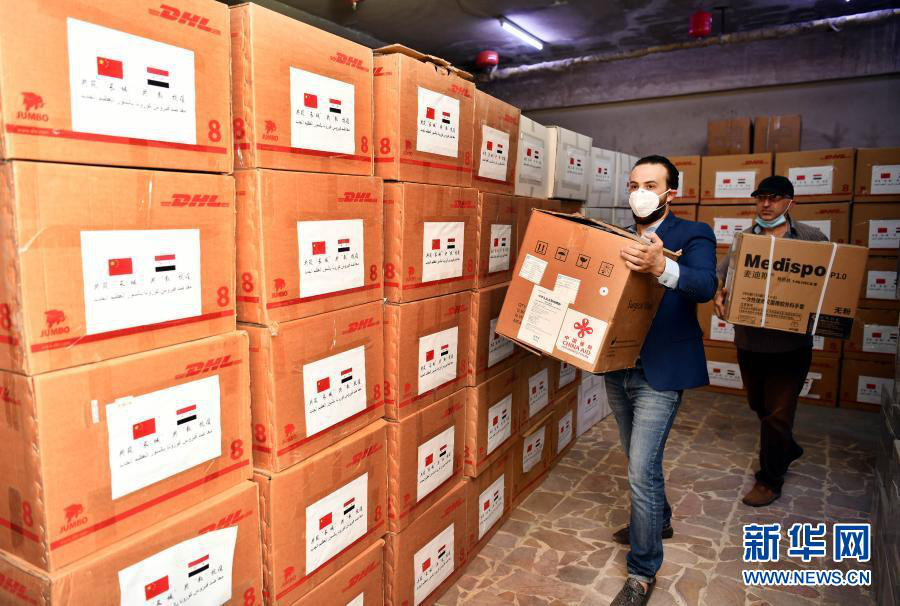 5月10日,在埃及首都开罗,工作人员搬运中国政府援助的第二批抗疫物资。新华社记者 邬惠我 摄