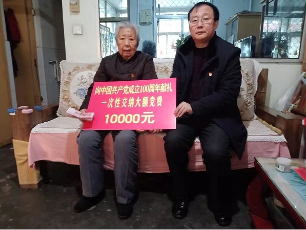 1月21日,淄博市淄川区干休所93岁老干部谭德芝同志一次性向党组织交纳10000元大额党费,向中国共产党成立100周年献礼。她满含深情地说“我年龄大了,啥也干不了,就多交点党费,表达一下心意吧”。淄川区委组织部副部长、老干部局局长许业刚同志代表党组织接收谭德芝的大额党费,并已通过区委组织部上交中组部。 谭德芝,1928年3月出生,1944年11月参加革命工作,1949年2月加入中国共产党。多年来,她与老伴白光标(全国离退休干部先进个人、山东省优秀共产党员,2020年8月去世)用自己省下来的养老金,积极向党组织交纳大额党费,捐款出资救济弱势群体,参与社会慈善公益事业,先后交纳大额党费近7万元、各类捐款达15万元。