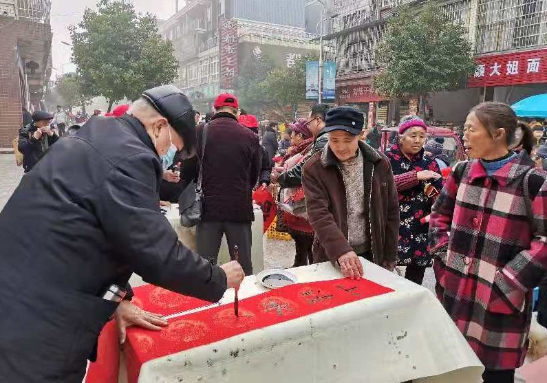 1月28日,南溪区老有所为志愿者服务大队老研会成员一行13人,不畏严寒奔赴仙临镇,开展了离退休干部助力城乡基层治理送文化下乡活动,为乡亲们送去了新春祝福。 活动设置在仙临场镇街道旁,为广大村民们展出了刘家镇大庙村脱贫攻坚的照片,以及会员们创作的绘画、毛笔书法等作品。正值赶场之日,村民们纷至沓来,感受浓浓的文化氛围。近3小时的活动时间里,志愿者们为村民赠送了提前写好的春联100副、“福”字100张;书画组成员则现场为乡亲们写送春联100余副、“福”字100余张。活动现场喜庆热烈,乡亲们喜笑颜开。会长郭理坝不禁赋诗一首《送文化下乡》:“乘风破雾白云边,老骥仙临喜讯传。执笔挥毫文化送,城乡一体庆丰年”。会员邓彬也感赋一首:“雨霾岁末识风寒,老干仙临写对联。志愿宣传存大爱,红红火火迎牛年。”